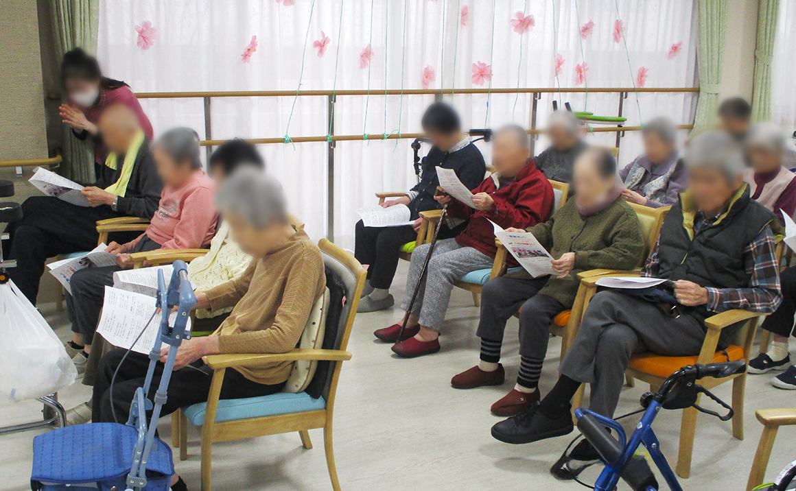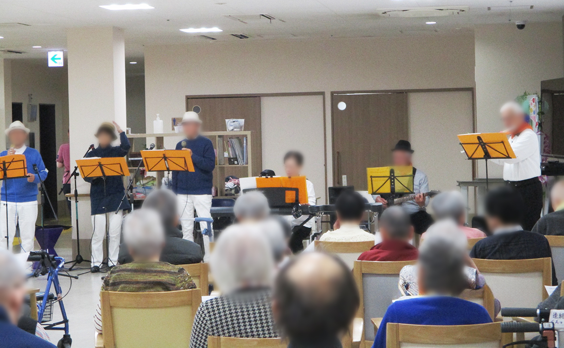 歌の出前館の皆様が来て下さり、生演奏と歌を唄ってくださいました。 久しぶりに聞く生演奏で、ご一緒に懐メロや童謡等を歌われました。 利用者方からは「生演奏で久しぶりに歌って気持ちよかったわ」と仰って頂き 終了後にはボランティアの方に「今度いつ来てくれるの?」等とお話をされてお別れを惜しんでいました。