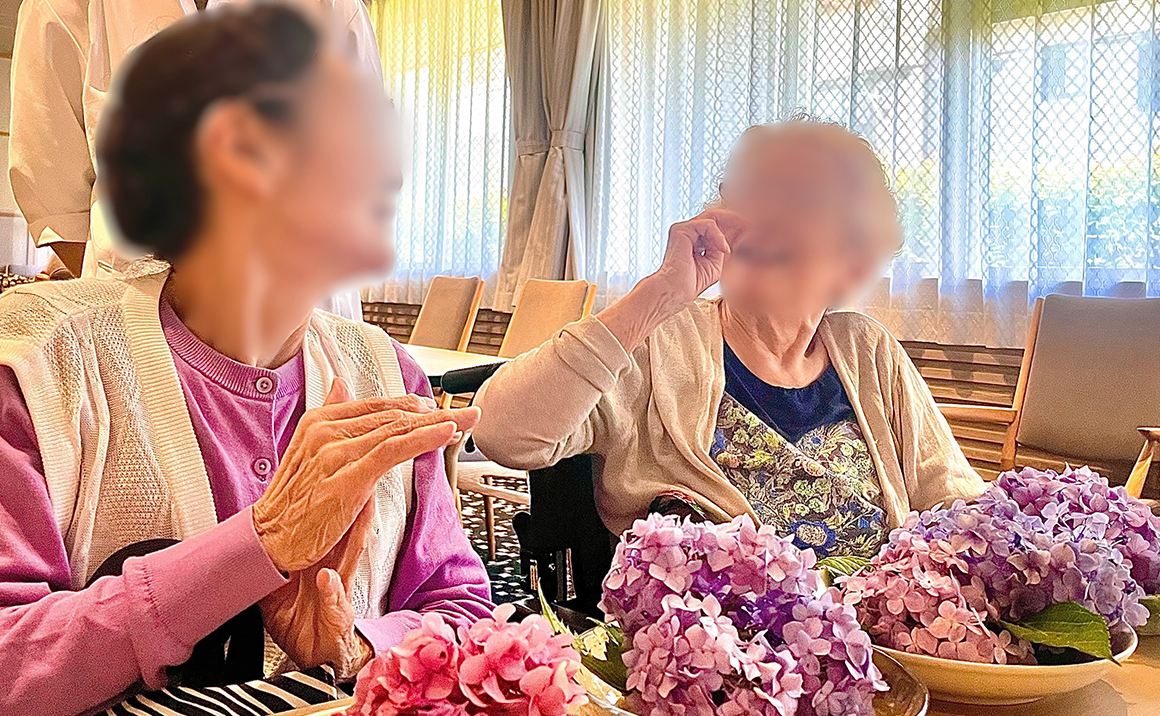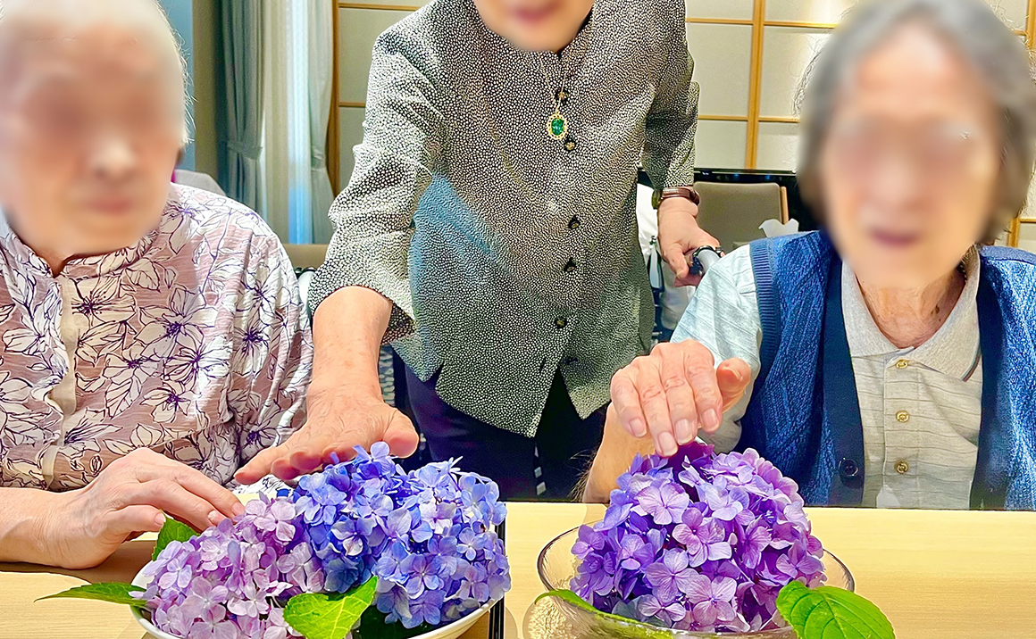 実際に紫陽花に触れていただき、ご入居者様は