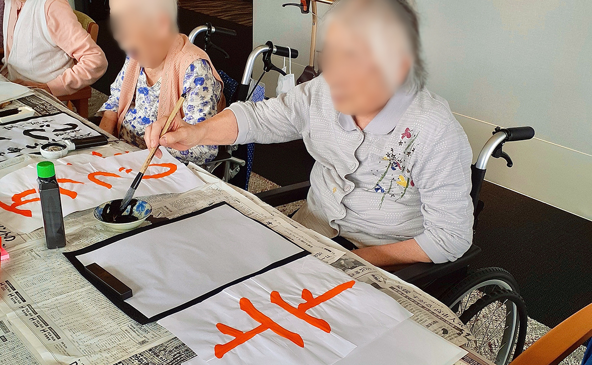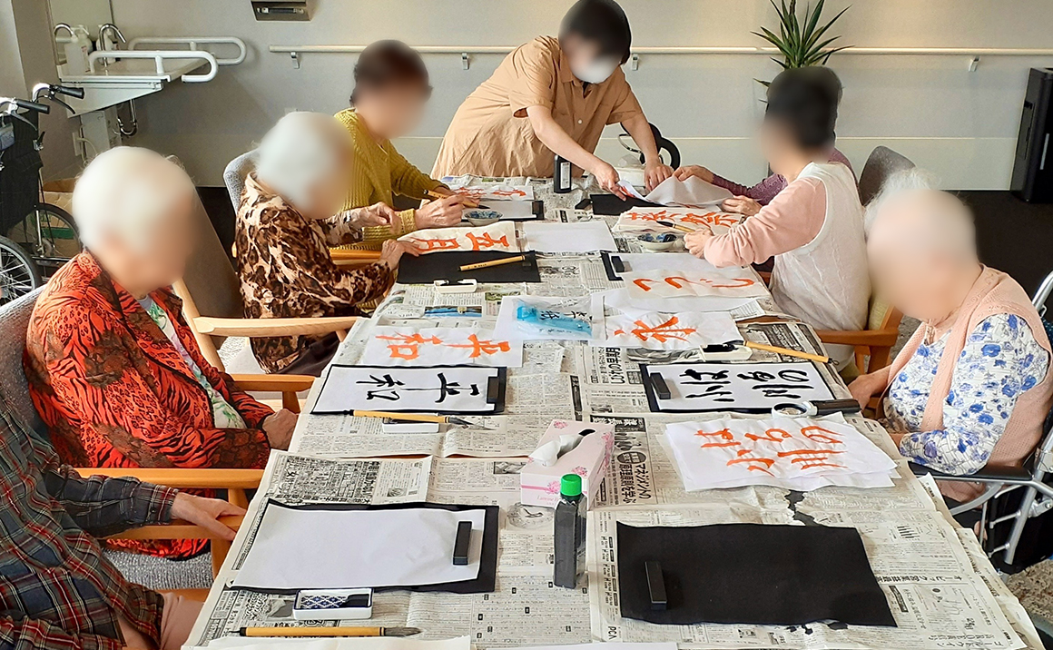 書と向き合う時間は、ご入居者様の背筋も伸び、室内には凛とした空気が流れます。 いつもの和やかなイベントも楽しいですが こうして一つのことに集中する時間も大切ですね。
