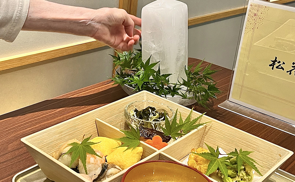井上料理長の演出の、氷柱と青紅葉の飾りで涼しさも感じていただけたご様子です。