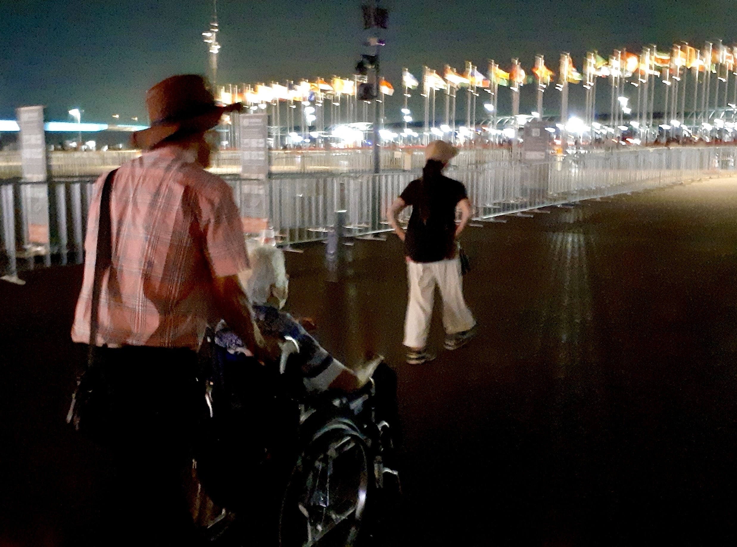 この日は天候にも恵まれ、海風が気持ちよく吹いていました。 日が暮れて、大屋根リングから万博内の夜景を見ると 「こんな綺麗な夜景久しぶりに見たわ。」と、瞳を輝かせて夜景を眺められていました。