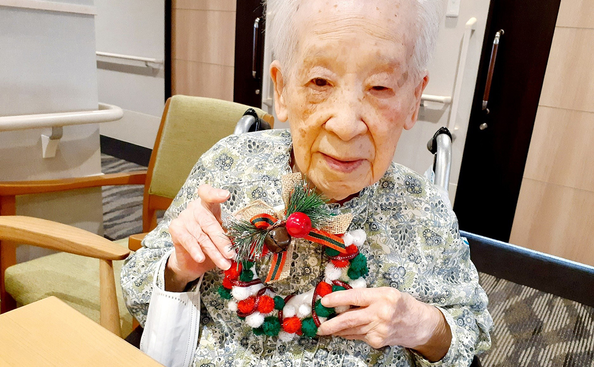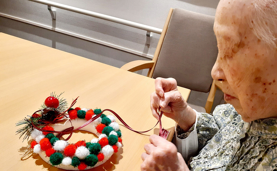 本日は、クリスマスリース作りの様子です。 一足早く、クリスマスのリース作りをしました。 発泡スチロールの輪っかにクリスマスカラーの柔らかいボールを貼り付け、リボンを巻いて飾りを針金で刺したら完成です。 指先が思うように動かないご入居者様にも参加していただくことができました。
