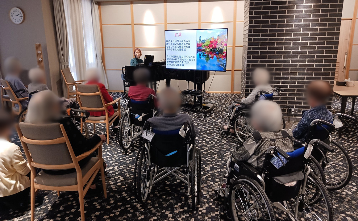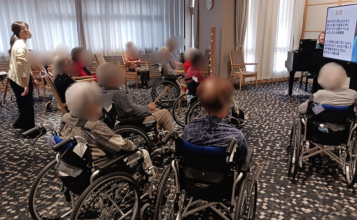 ご入居者様は音楽療法で大きな声で歌って下さり賑やかな時間を楽しく過ごしていただいております。