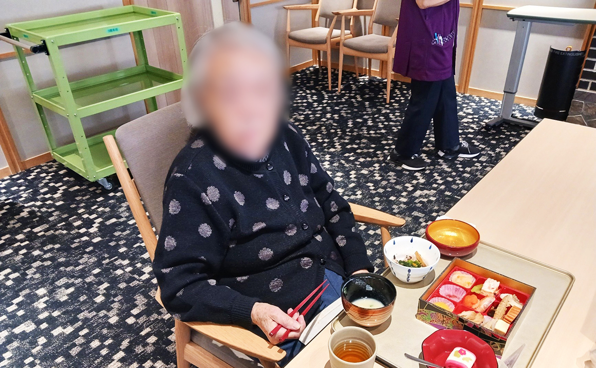 『彩り3種盛り』は豪華で美味しく、『お雑煮』は白みそ仕立てでとても美味しいとご入居者様達から大変好評でした。 お飲み物は「澪」を準備し皆様非常に喜ばれて「美味しい」「おかわりちょうだい」と仰りおせち料理、お赤飯と合わせて「豪華で美味しい」「見た目も奇麗で食べるのがもったいない」と笑顔がたえませんでした。