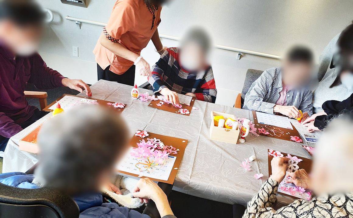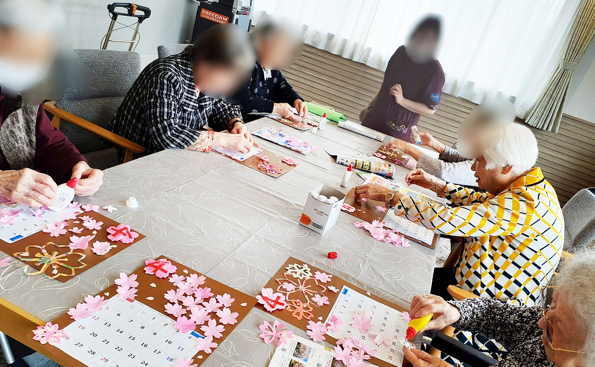 4月のカレンダーは折り紙で作った桜の花を、好きなだけ貼っていただきました。 貼り方も様々で、デザインや大きさ違いの花弁を重ねて貼るなど、個性あふれる作品が出来上がりました。 金色地にピンクの桜、花びらがよく映えて、お部屋がひときわ明るく春らしくなったと後入居尾者様だけではなく職員からも好評でした。