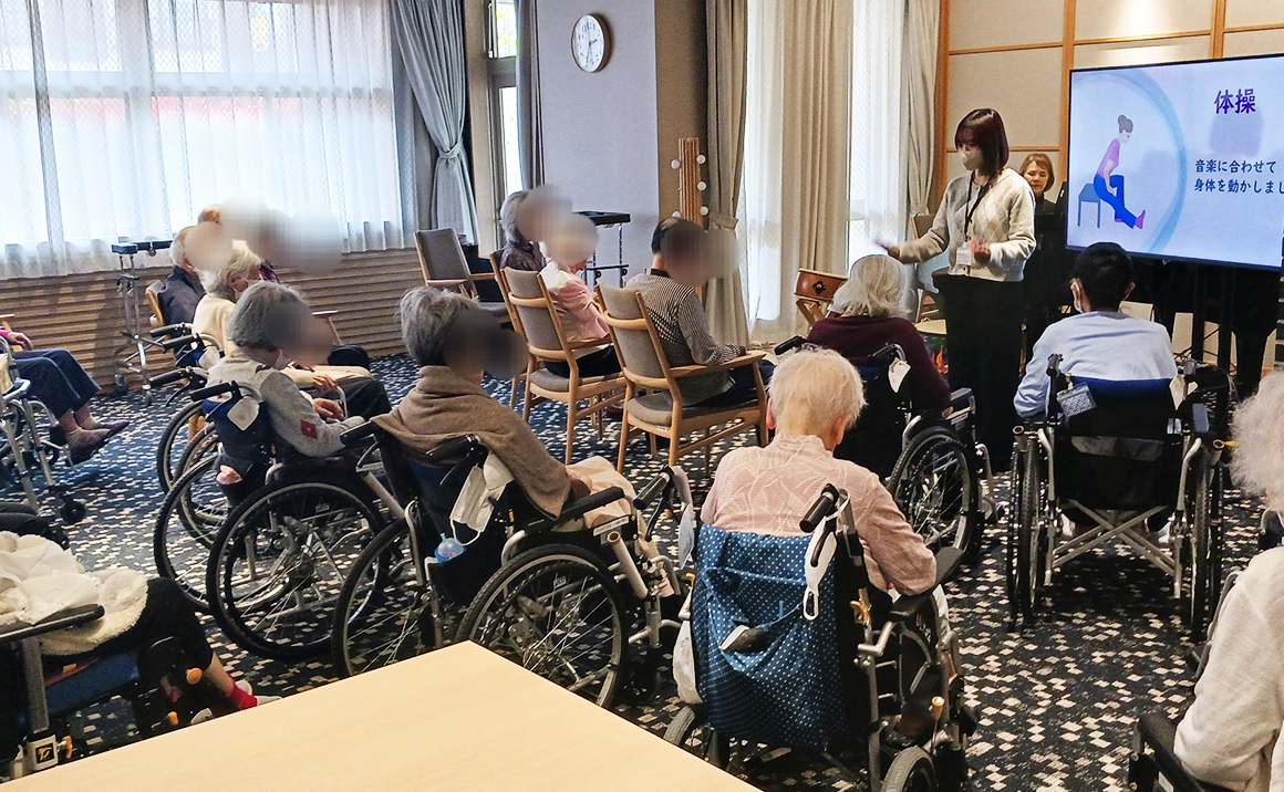 本日はケア21の音楽療法をしました。 最初はピアノに合わせて皆様で合唱をされその後に体操をしていただきました。