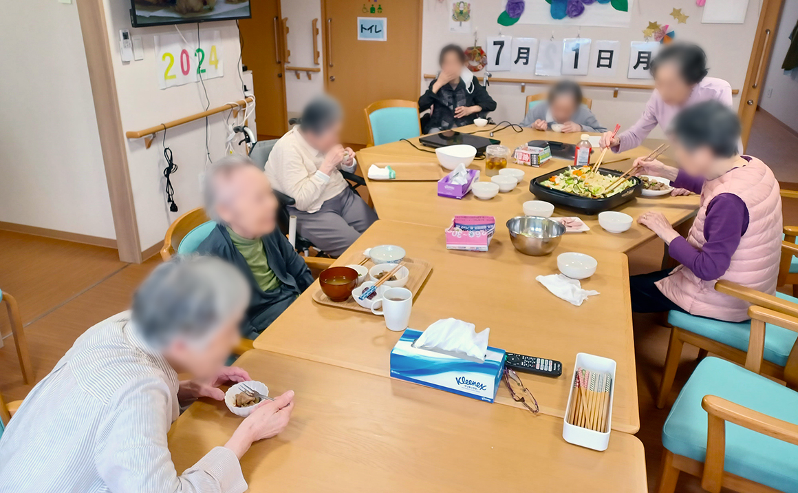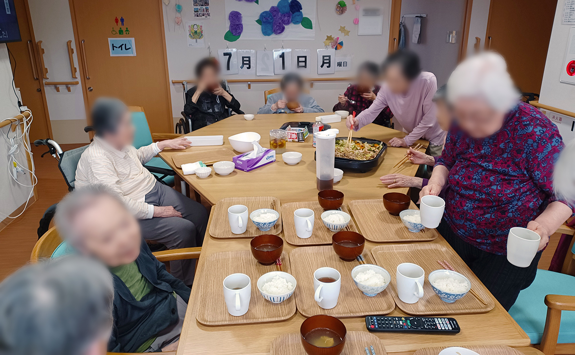 たのしい家喜多見では毎食利用者さんと一緒に献立を考えたり、調理を行っているのですが、 3階では「焼き肉が食べたいねぇ」と意見が出たため、急遽焼き肉パーティを開催しました! たくさんのお肉と野菜を大きなホットプレートで炒めて、具材盛りだくさん焼き肉パーティになりました😊 3階の利用者さんだけでなく、他フロアの方々も呼んで頂き、フロアを超えた交流もできたとても楽しい会になりました。 今後もフロア合同でイベントなど行い交流する機会も増やしていきたいです。