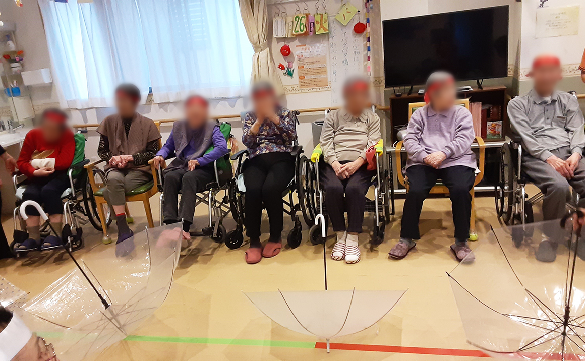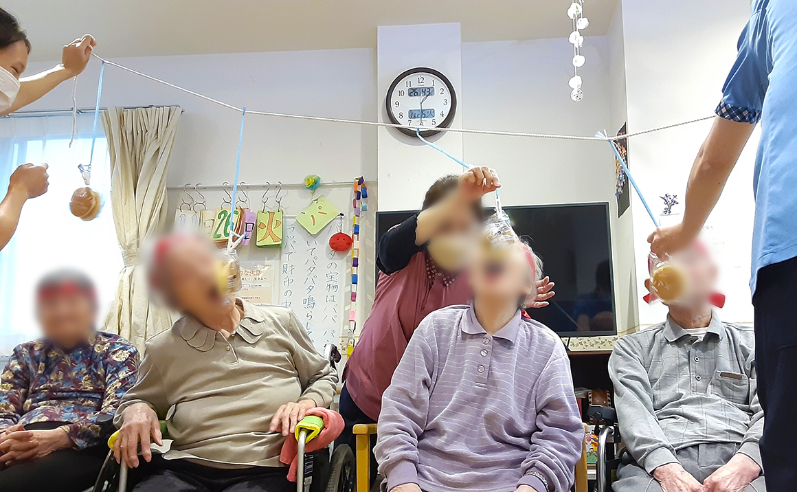やっと秋らしく街路樹も色とりどりに染まり始めました。 ここ楽しい家瑞光では、年間最大イベント「秋の大運動会」が、2階・3階合同で行われました。 先ずは選手宣誓に始まり、パン食い競争・フロア対抗風船バレー・玉入れ等… 紐を引っ張りパンをかじる方、手を思い切り伸ばして風船を打ち返したり、見事かごに玉を入れたり、皆さん久々の運動会に思わず歌も飛び出したり。 さあ、金メダルはどちらのチームに⁈ メダルを胸に皆さんの笑顔が金メダル以上に輝いていたのは言うまでもなく!!