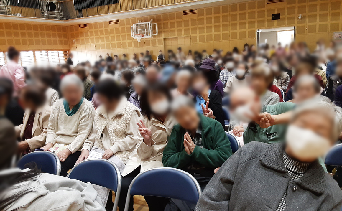 当日、小学校の体育館で9時半から12時までフェスティバルが開催され、参加者が約300人程。