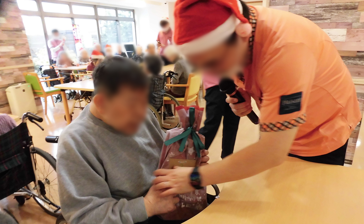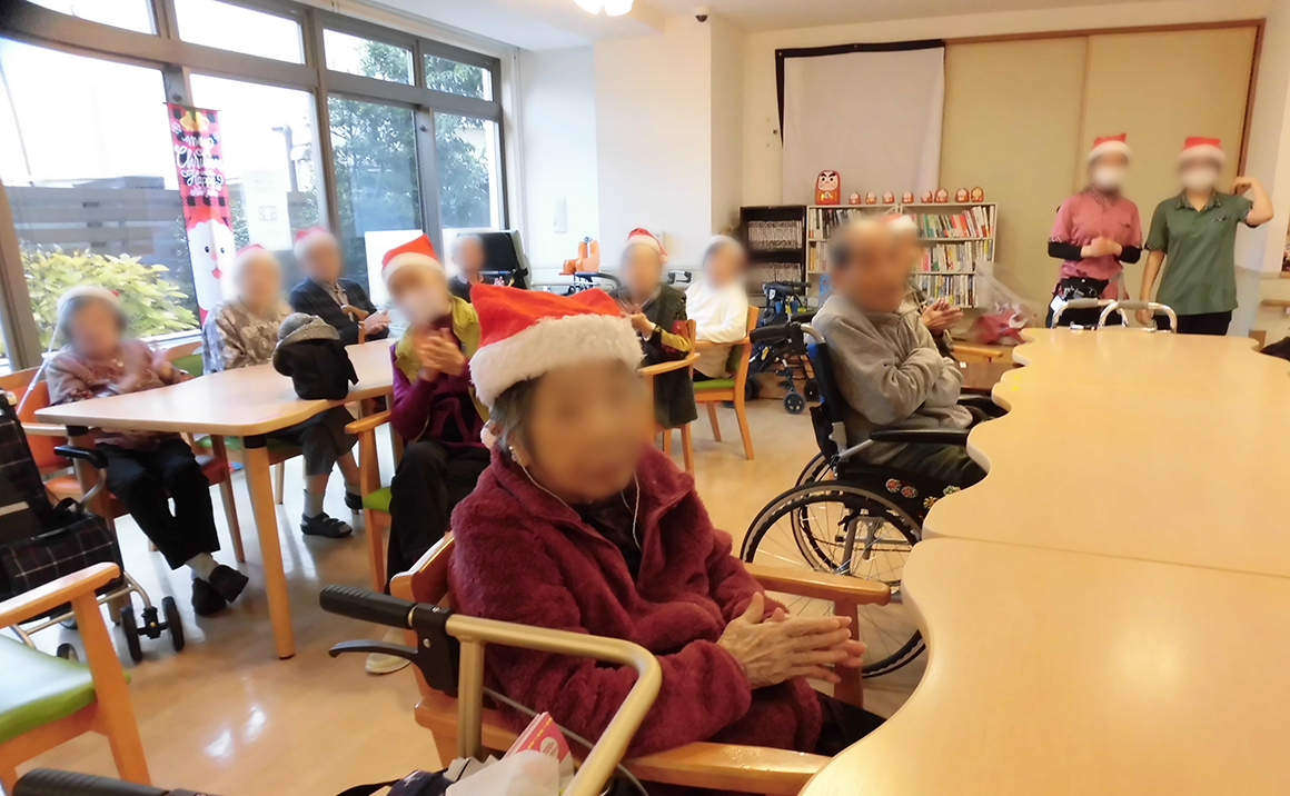 プレザンメゾン此花高見では、本日今年最後のイベントである『クリスマス会』を開催いたしました。 クリスマスソングを職員と入居者様と大合唱でスタートし、『ビンゴゲーム』では盛大に盛り上がり、入居者様のプレゼントを受け取られる笑顔がとても素敵でした。 最後には施設より入居者様全員にクリスマスプレゼントをお渡しすることが出来ました。