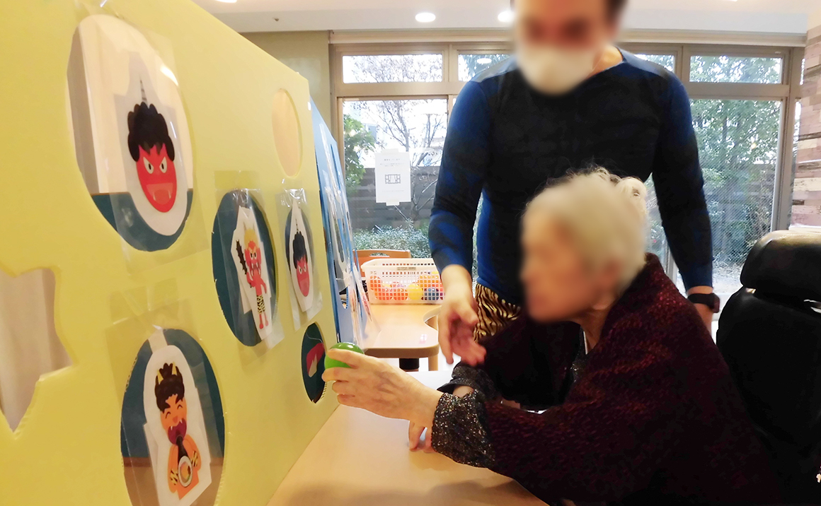 プレザンメゾン此花高見では、2月2日節分のイベント豆まき『鬼は外 福は内』でした。 ボールを使って鬼の的にあてるゲームで、鬼にはそれぞれ点数がついて高得点の入居者様には豪華景品が頂けるというゲームを行いました。 入居者様、真剣に鬼をめがけてボールを投げておられ声援あり、時折笑いありの楽しいレクリエーションを行うことが出来ました。