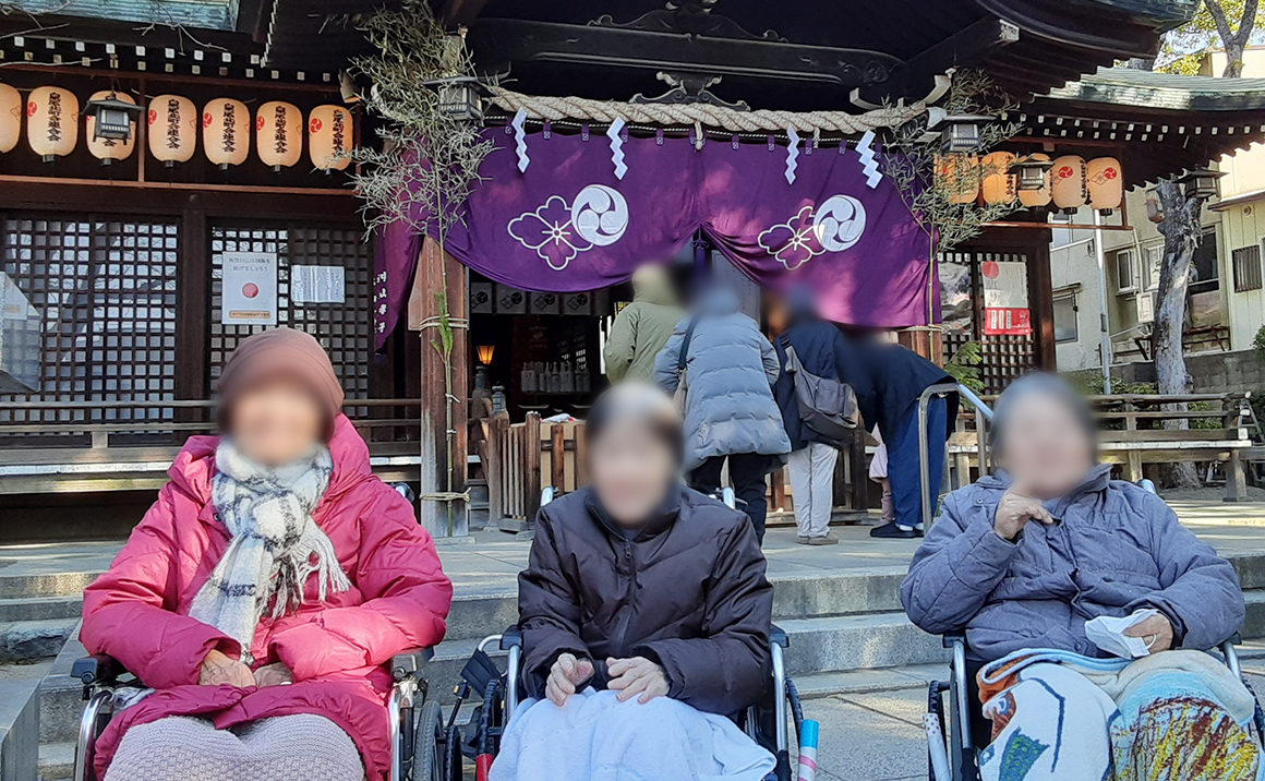 あけましておめでとうございます。 新年を迎え、近所の神社へ初詣に行きました。 寒い日でしたが、よく晴れていましたので、新年初の外出を皆様楽しんでおられました。 神社では、それぞれ願いを込めて参拝されました。 お陰様で、寒さで体調を崩される方もおられず、良い新年のスタートを切ることができました。 今年も皆様が健康で毎日を笑顔でお過ごしいただけるように、我々スタッフ一同努めてまいりますので、どうぞよろしくお願い申し上げます。