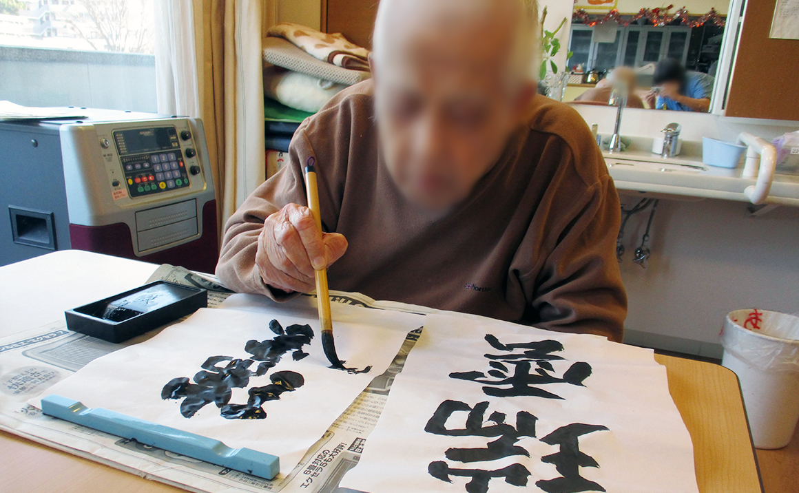 2日は、お正月の風物詩、書初めをしました。普段レクリエーションに乗り気でないご利用者様も、書初めはお好きのようでしっかり筆を握っておられました。