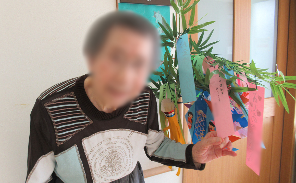 7月7日の七夕には入居者の皆様に短冊に願い事を書いて頂き笹に飾り付けさせていただきました。 「家族の健康」「好きなものを買いたい」「お寺巡りをしたい」といったお願いや「年金が欲しい!」と言われている方もいました。