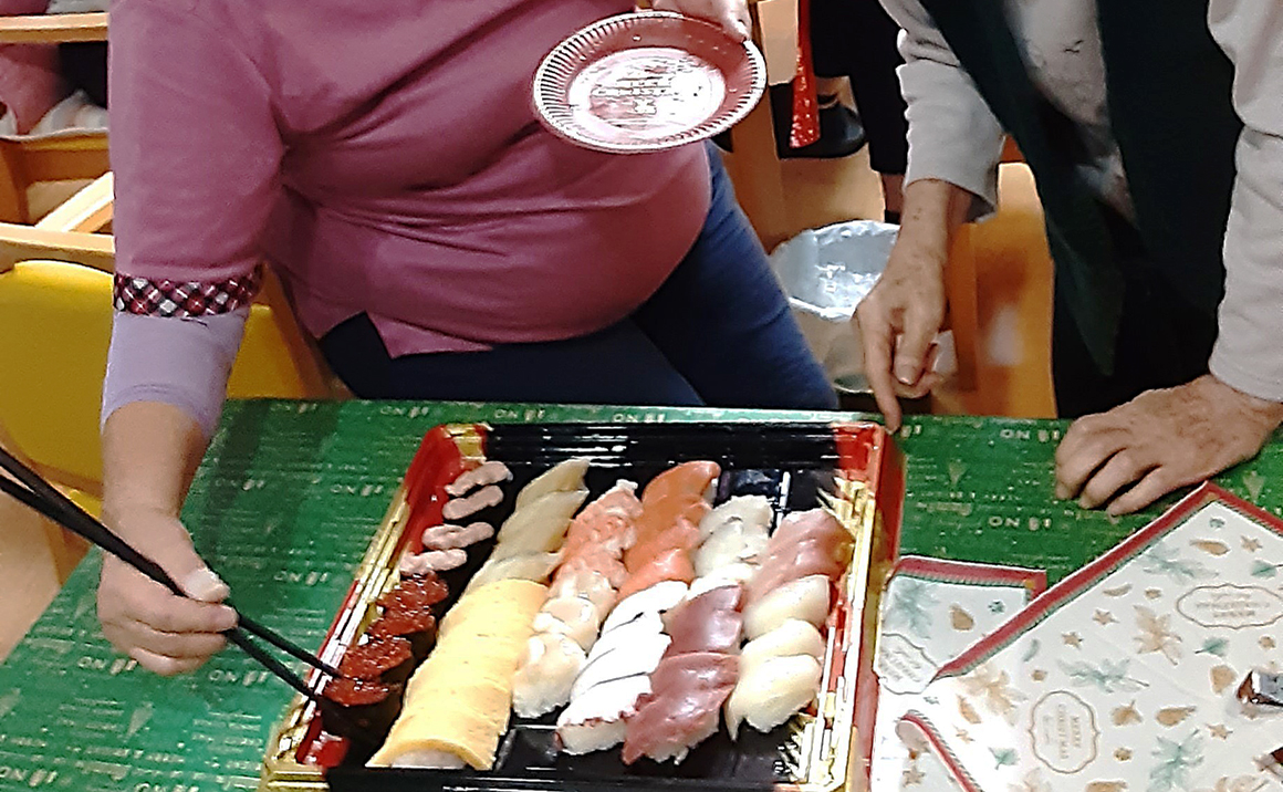 年末恒例「クリスマス会」を開催しました! ノンアルコール・カクテルで乾杯し、特製握り寿司を食べ、おやつでクリスマスケーキを味わい、 とても素敵な師走の一日を楽しみました!