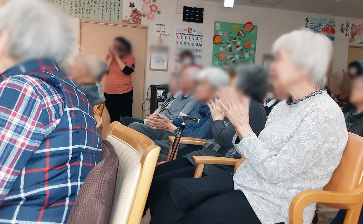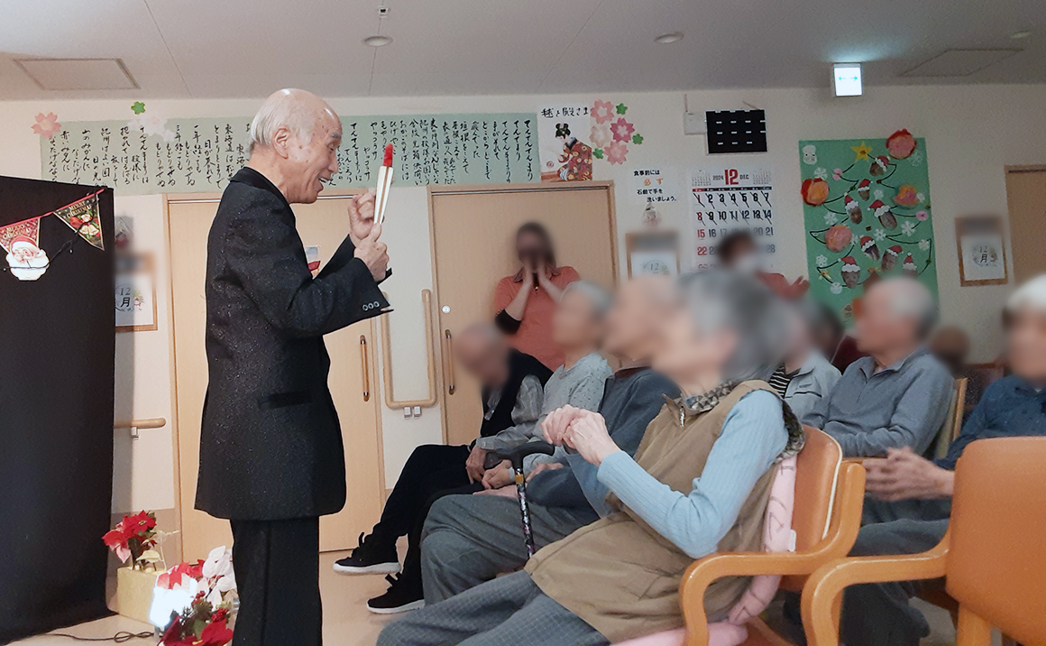 紙吹雪がキラキラと舞う中、摩訶不思議なマジックを沢山見る事が出来て、入居者の皆様に