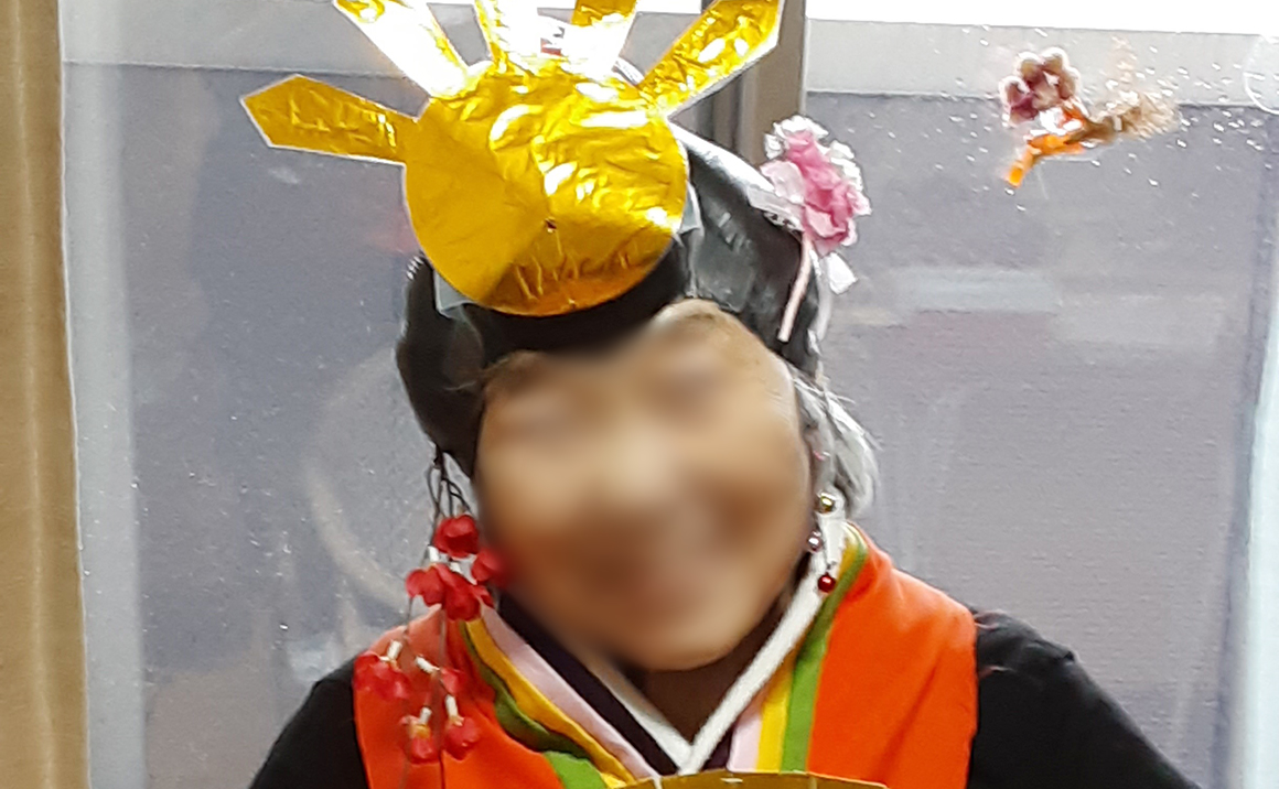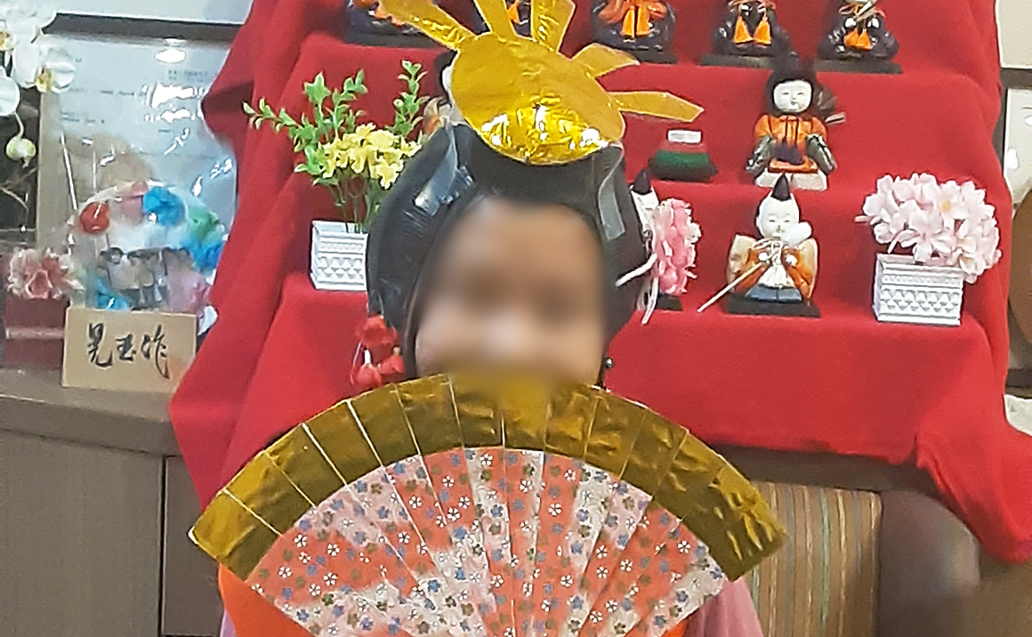 ご利用者様にお雛様のカツラをかぶって頂き、写真を撮影しました。 皆さま、笑顔いっぱいです。
