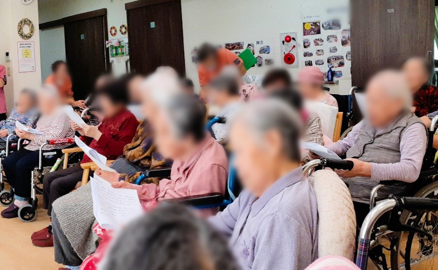 入居者様には歌詞カードをお渡ししていたため、皆様で懐かしい曲を合唱され、