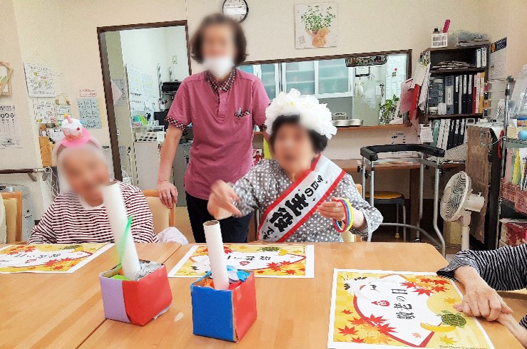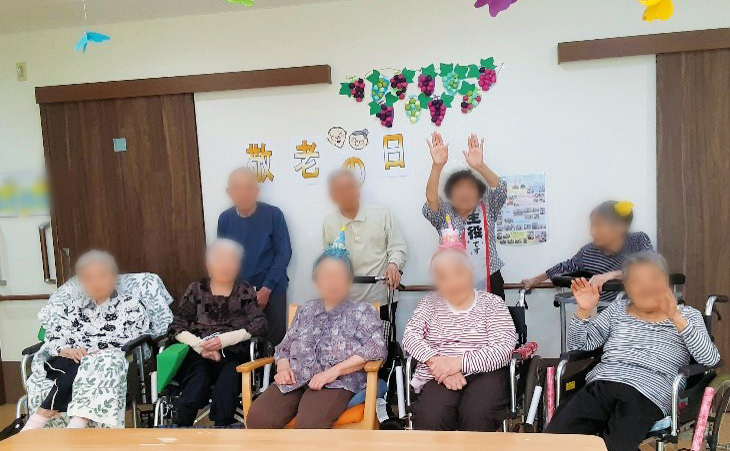 敬老の日には、88歳の米寿を迎えられる女性の誕生日会を開催しました。 歌や踊りが大好きなご本人も笑顔で参加され、和やかな雰囲気の中、皆様でお祝いしました。 そして、輪投げゲームを楽しみ、大盛り上がり! 真剣に挑戦される姿が印象的でした。 お食事には、特別メニューの「花散らし寿司」をご提供し、 華やかな見た目と美味しさに、入居者様方に大変喜んでいただけました。