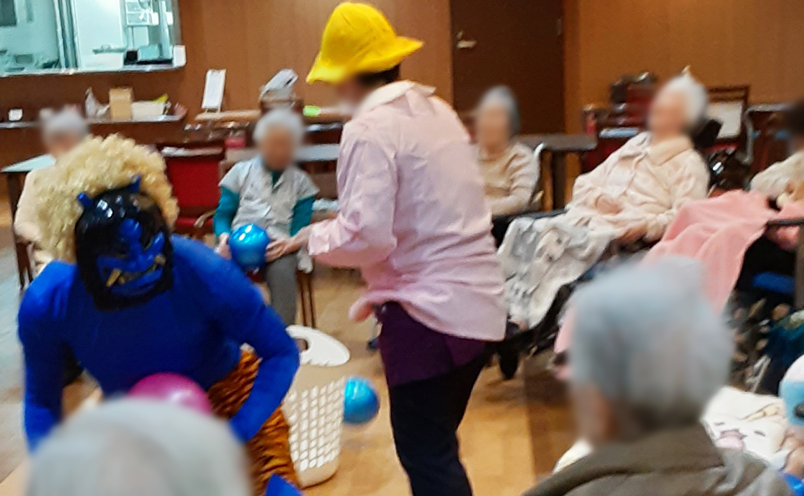 今年の節分は、2月2日!(^^)! フルーツバスケット体系でご入居者様に集まって頂き、赤鬼・青鬼を呼んで、カラーボールを当てて頂きました!!(^^)! 皆様終始満面の笑みで盛り上がりました(*´ω`*)! 幼稚園児の仮装をした職員も現れ、さらに笑いを誘いました!(^^)! 今後もさらなる笑いを皆様に届けていきたいと思います。