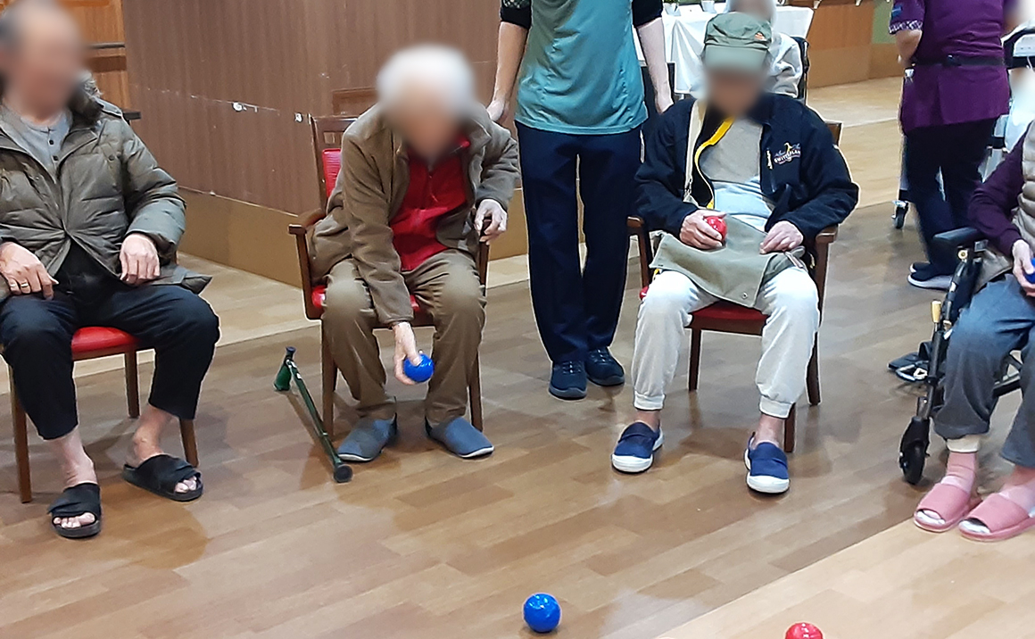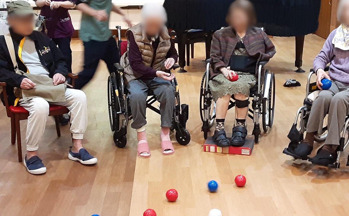 プレザングラン新宿下落合では楽しみながら身体を動かすレクリエーションを大切にしています。 この日はボッチャを行いました。 ボッチャは白いボールに向かって赤と青のボールを投げ、どれだけ白いボールに近づけられるかを競うスポーツです。 皆様、真剣な表情で狙いを定めながら、笑顔で楽しまれていました。