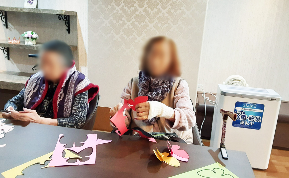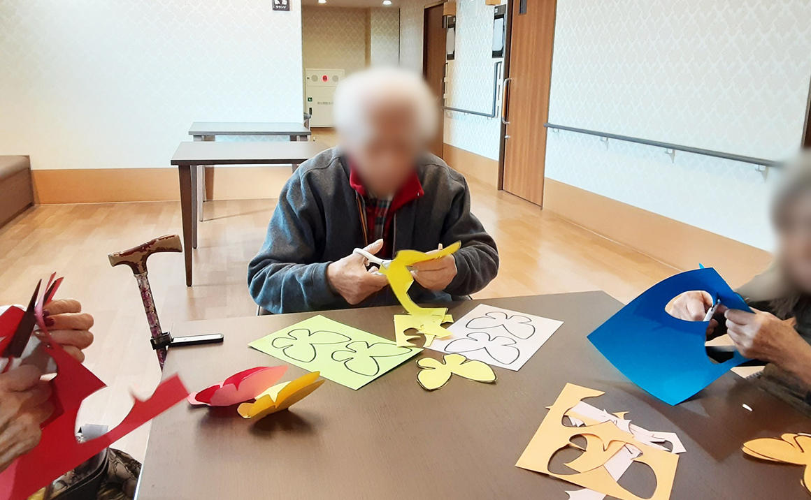 本日はレクリエーションの時間に蝶の飾りを作りました。 色紙を蝶の形に切り抜き、ビースと一緒に紐でつなげて飾りを作ります。 皆様、はさみを上手に使って丁寧に蝶を切り抜いてくださいました。 完成した蝶の飾りは絵手紙の周りに飾り付け、春らしい華やかな壁飾りが完成しました!
