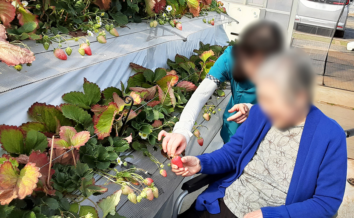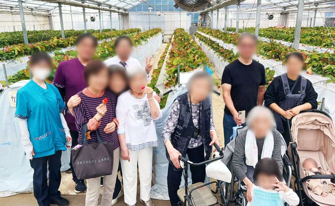 毎年恒例のいちご狩りに、埼玉県新座市のいちごさんぽ園さんまで、いちご狩りに行って参りました。 ハウスの中は、甘くて大きないちごがたくさん!所々、ハチさんもせっせと足に花粉をつけて花を巡っています。 車椅子で初参加されました100歳の入居者様も、大きないちごをガブリ!「美味しい~」と飛び切りの笑顔です。 皆様、ひとパック以上召し上がられでました。 今年も、思い出の1枚を撮ることができました。