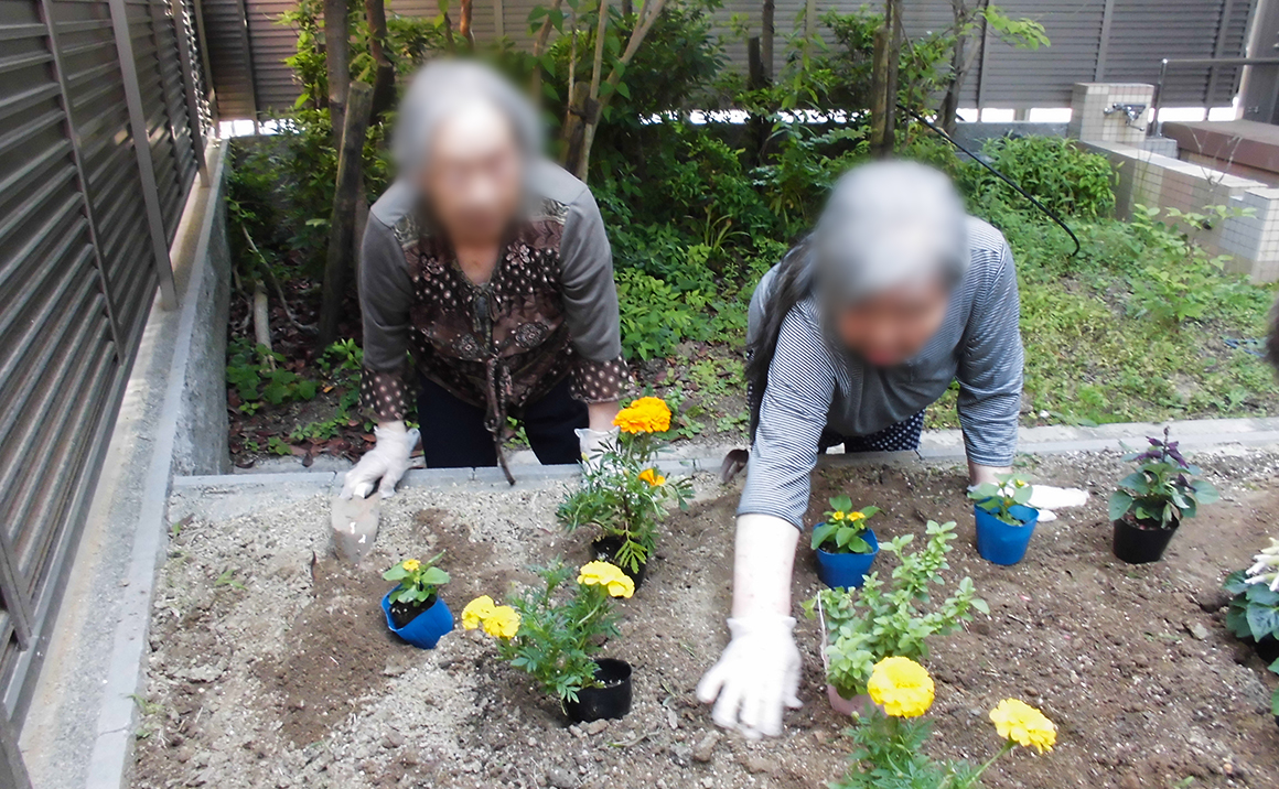 5月植えた向日葵の種が、元気良く芽を出しました。 追加で植えたお花を入居者様と楽しく鑑賞しました。 夏祭りに向けてうちわ作りを行いました。 ハサミやのりを使用し「なかなか上手くできんな~」と少し苦戦しながらも完成すると笑顔見られました。