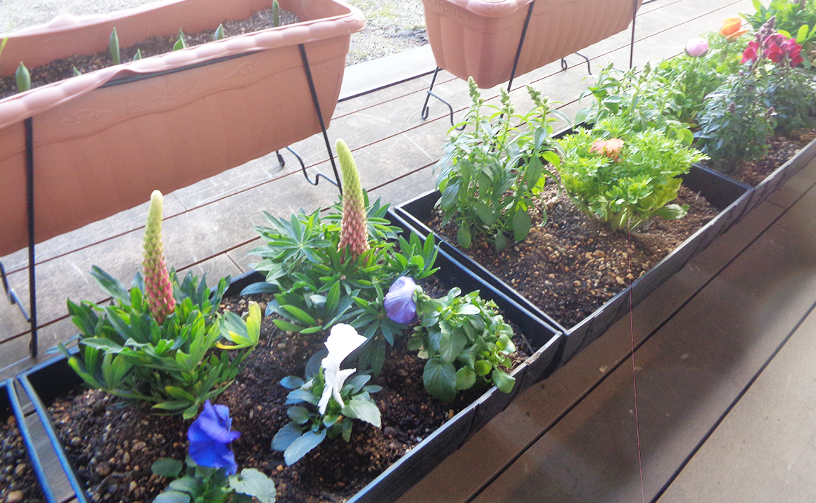 春に先立ち、プランターの寄せ植えや観葉植物の模様替えをしました。 食堂から眺めるグリーンカーテンをはじめ、中庭のプランターに可憐な花が並びます。 今冬初めに植えたチューリップの芽も8㎝くらいに育っています。