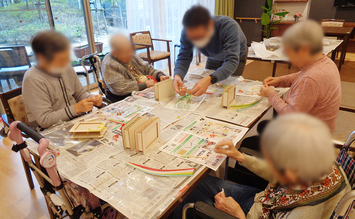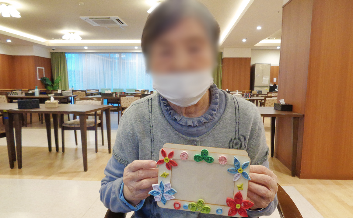 毎月定期開催の作品作りの教室です。 今回は、ペーパークイリング技法で、フォトフレームを作成しました。 細長いカラー用紙をクルクル巻いて模様を作るのですが、指のリハビリ体操を兼ねた 単純作業にみなさま没頭されていました。お疲れさまでした(^^)/