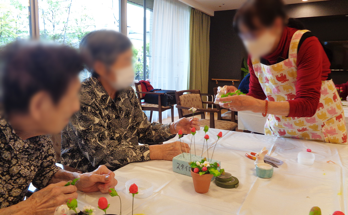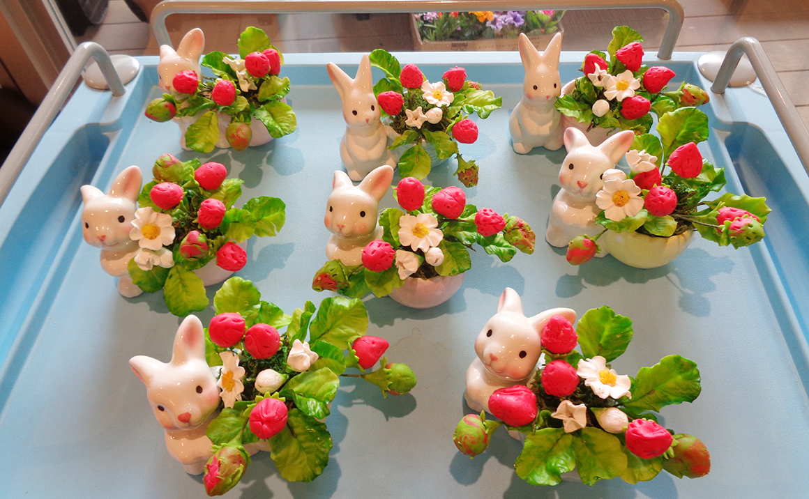 今月の教室では、パンフラワー粘土で『苺』を作りました。 うさぎのポットに飾り付けると、皆さんの顔がほころんで、『可愛い~』と大絶賛でした。 先生はおしゃべりをすること、指先を使うこと、自分なりのアレンジをすることを大切に 教えてくださっていて、和やかで楽しいクラスです。