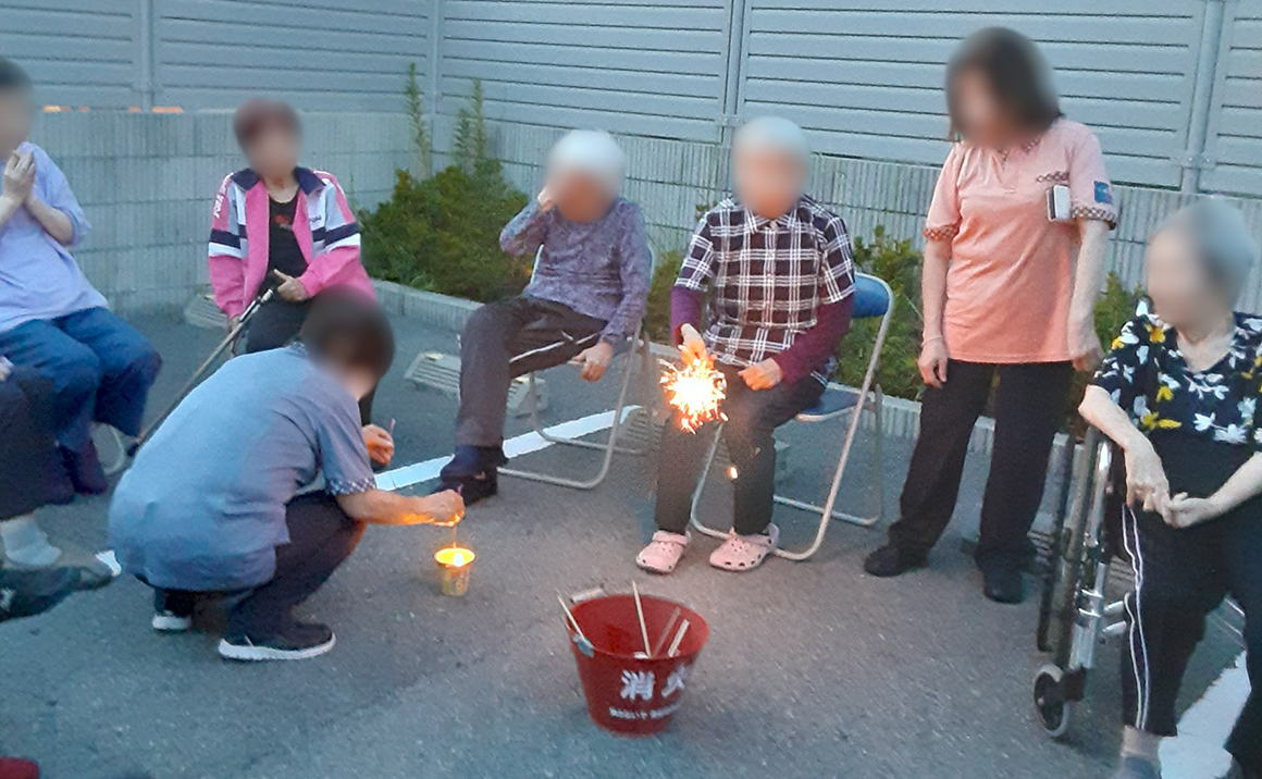 まだまだ暑い日が続いてますが、たのしい家垂水の入居者様は今日もお元気に過ごされています。 本来は先月開催予定ではありましたプチ花火大会を開催いたしました。 職員及び入居者様と一緒に楽しい時間を過ごしました。