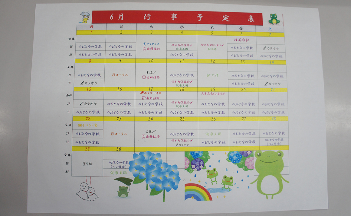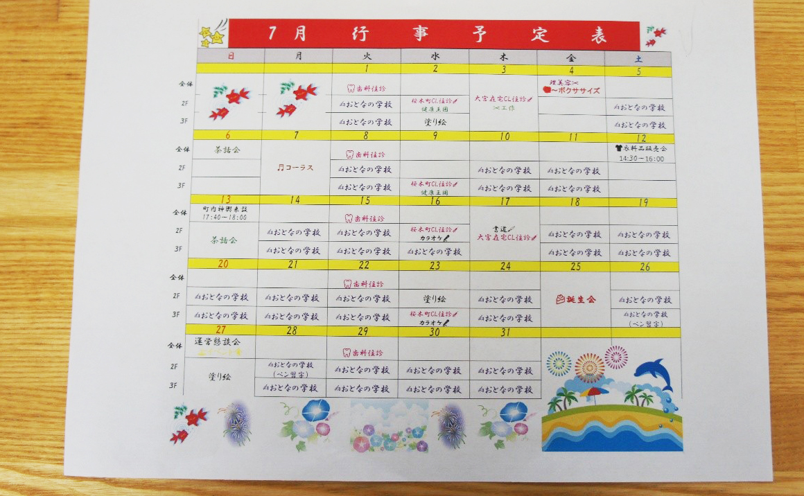 当ホームでは、個別リハビリ・集団リハビリに力を入れております。又、医療との連携を密ししており、美味しいお食事、イベントなどを通し、皆様が笑顔でたのしくお過ごしいただけるよう支援しております。スタッフがご入居者様のご要望をじっくり伺うことから始め、日々ご入居者様と接する中での「気づき」を大切にすることで、ご入居者様が自分らしく過ごしていただく為に必要なサービスは何かを常に模索し、ご入居者様に「入って良かった」と喜んでいただけるホーム作りを目指しております。サークル活動(コーラス部・園芸部・手芸工作・英会話など)もご入居者様の趣味をお聴きして、たのしんで頂ける活動をしております。また、ご入居者様参加型のイベントも開催しており、納涼祭やひな祭りなども、準備段階からお手伝いして頂きながら、自分たちが企画したイベントだと実感して楽しんでいただく事を大切にしております。半年に1回、バス旅行ツアーも開催しており、ご家族様も同行できる旅行となっております。ゆとりのある施設介護をご提供しておりますので、 自然に囲まれたホームだからこそ可能なケアをご実感いただけます。
