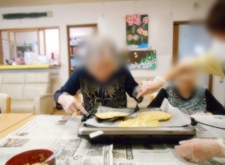 当ホームでは、夏祭りなどの催しを新聞のチラシ折り込みで知らせたり、毎月小規模で開催している認知症カフェの地域のふれあいサロンに参加したりして、地域の一員としての関わりを大切にしています。又施設内では車椅子に座って過ごすことが常態化しないように支援をして、身体の状況や気持ちに心配りをし束縛感のないケアや環境作りにに努めています。常に"たのしい""自分らしい" 暮らしを支援してまいります。 一緒に買い物や洗濯をしたり、食事を作ったりし、お互いに助け合いながら自立した生活が営まれるようにサポートいたします。