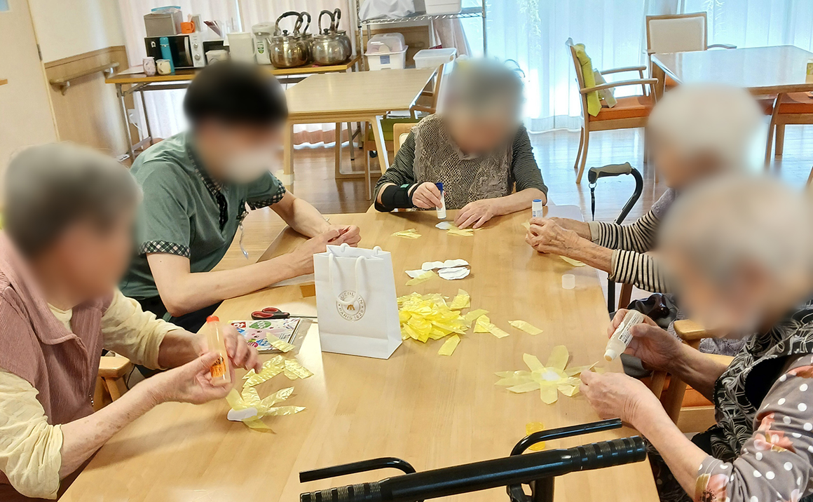玄関を入ると、開放感のあるフリースペースが広がり、ソファやキッチンなども設け、地域に根差した交流の場として、活用できるようになっております。お食事はプロの料理人による旬の食材を取り入れたおいしいお料理を提供しており、ご入居者様にも大変好評をいただいております。当施設では、ご入居者様の今「できること」を大事にして、元気な生活をお過ごしいただけるようサポートしています。