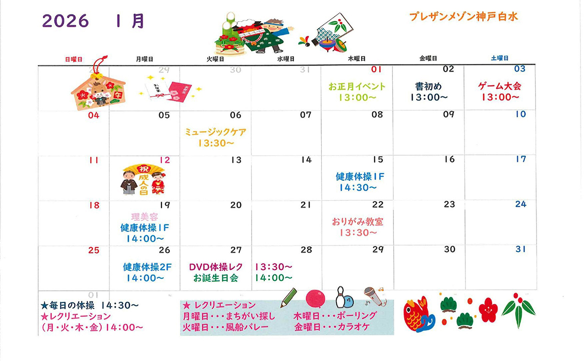 神戸市西区にある介護付有料老人ホーム「プレザンメゾン神戸白水」は、ご入居者様の生活リハビリを楽しみながら取り組めるようレクリエーションを充実させ、新たな趣味を持ちたい人にも満足していただけるような活動を行ってまいります。