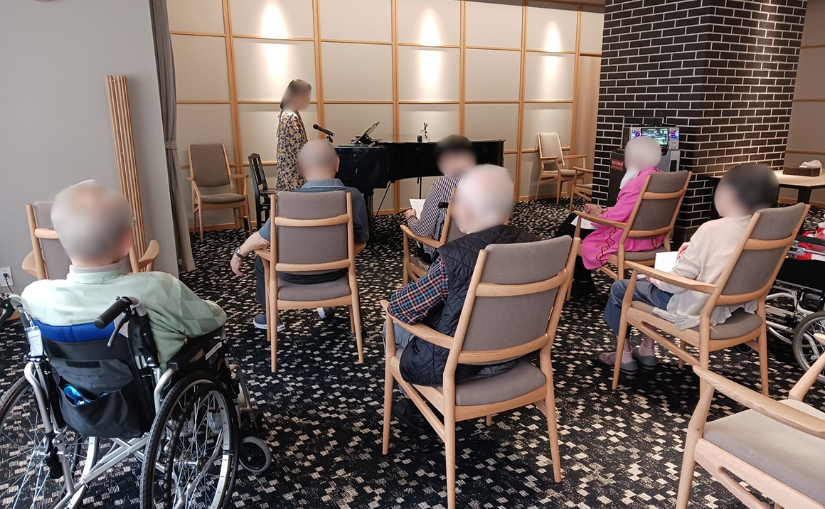 食堂兼機能訓練室にあるグランドピアノで音楽療法士による演奏を実施しています。参加される方には聴くだけでなく、歌を歌ったり、楽器を演奏してもらっています。