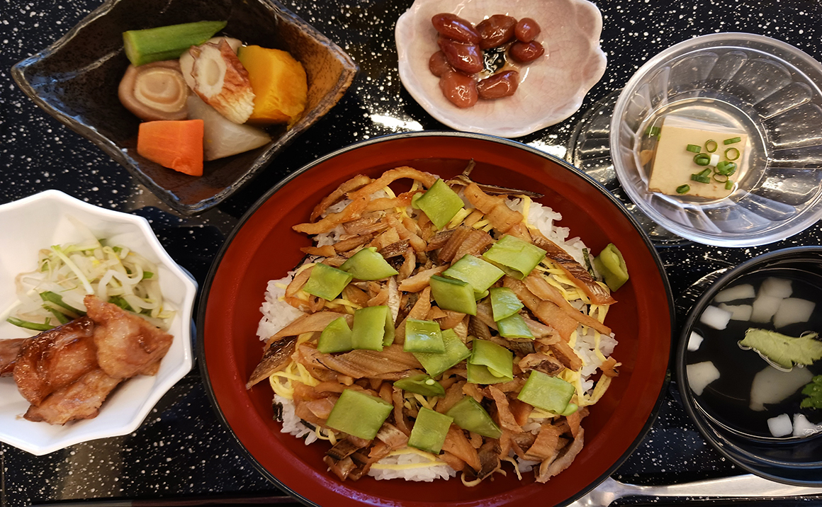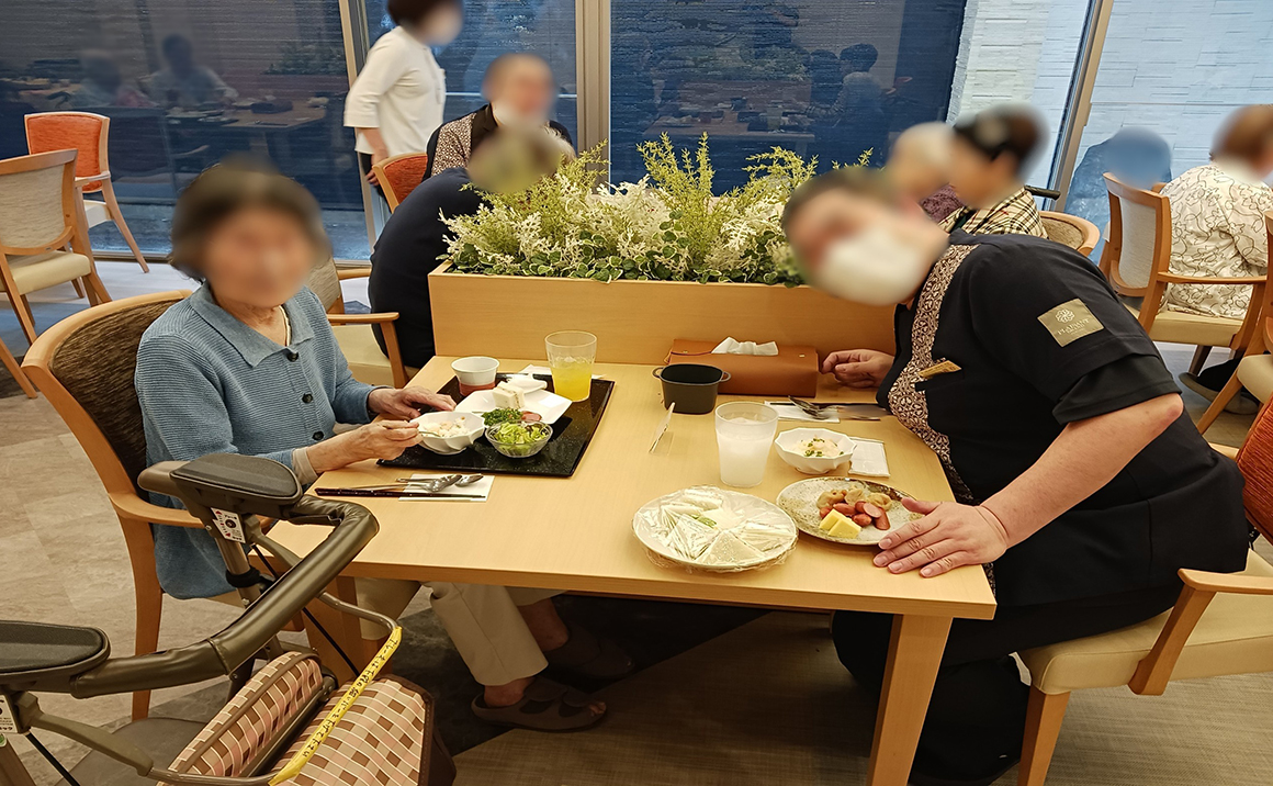 朝食は和食・洋食の2種類から、昼食は肉・魚・麺類・丼ものの4種類からメニューをお選びいただけます。ご注文いただいてから調理いたしますので、毎日出来立ての料理をご提供いたします。見た目も味にもこだわり、四季折々の食材を活かした食事をお楽しみいただけます。ミキサー食・きざみ食などお一人おひとりの状況に応じたご調整も可能です。