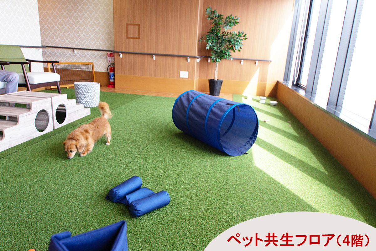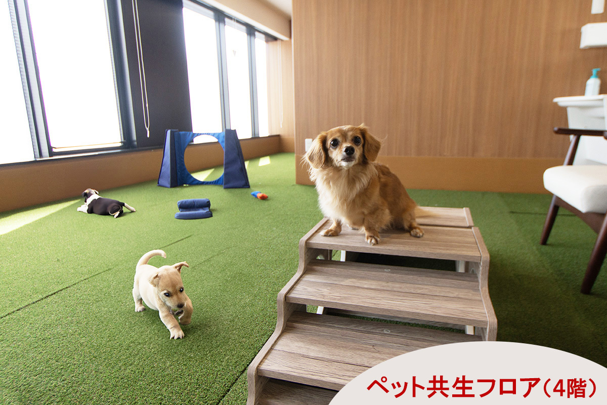 4階フロア14部屋は、全てペットと暮らせる「専用フロア」となっております。 フロアの中央にある広々としたドッグランは、いつでも利用可能。雨の日で、散歩に行けない日でも充分運動できます。 ペットシッターも配置しており、お世話に関するサービス提供・アドバイスも可能です。ご自宅でペットと暮らしている方には、飼い主様も愛犬・愛猫とこれまでと変わらず生活ができるとご好評いただいております。