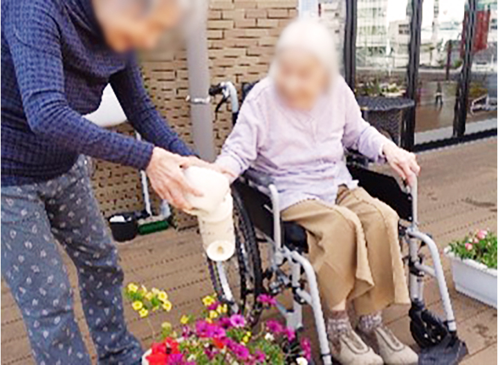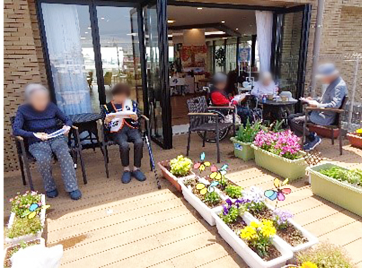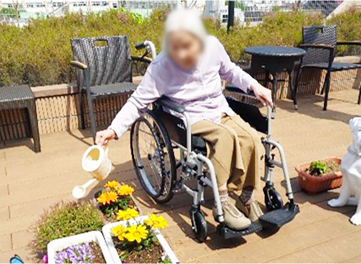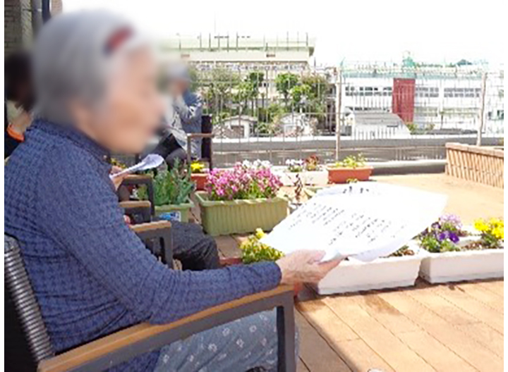 最上階のウッドデッキは皆様の憩いの場となっております。天気の良い日は協力してお花の水やり・外へ向かって歌をおもいっきり歌ったりしています。空にわぁ~と大声をだして日頃のストレスを発散‼‼