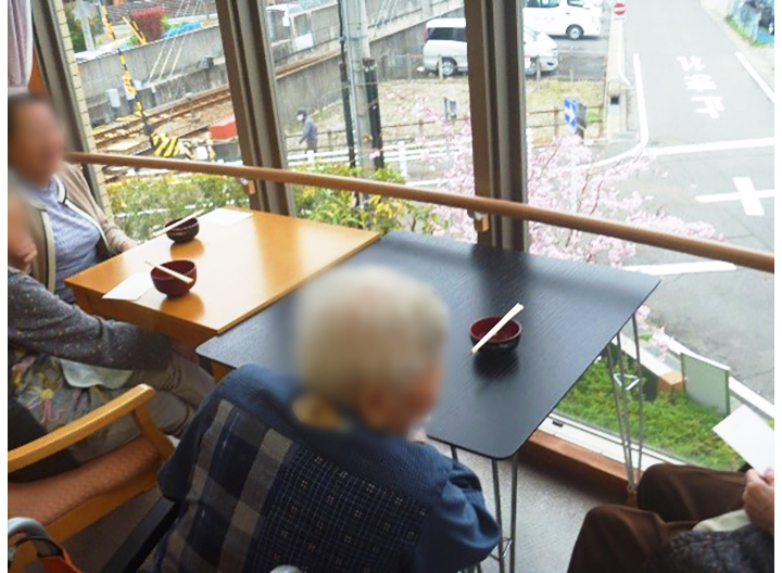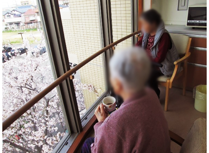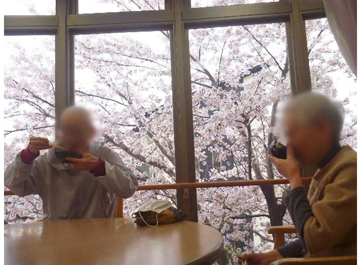 プレザンメゾンあじま南側に桜の木が有り、今年も見事に満開となりました。今年はピンク色の枝垂桜も綺麗に咲き、皆さんの目を引いています。3階の窓からは桜を上から見る事が出来、毎日お茶を飲みながら楽しまれています。2階では今年もぜんざい会を開きました。桜も綺麗で、ぜんざいも美味しかったと皆様の笑顔も満開でした。