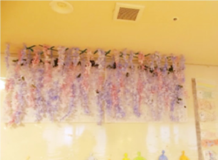 今月、食堂は藤が天井まで覆いつくし鯉のぼりがゆらゆらと泳いでいます🐡