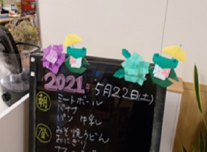 食事のメニューを書いているボードには折り紙でできた可愛らしいカエルがいます♪