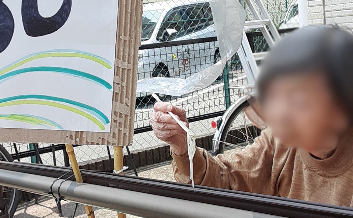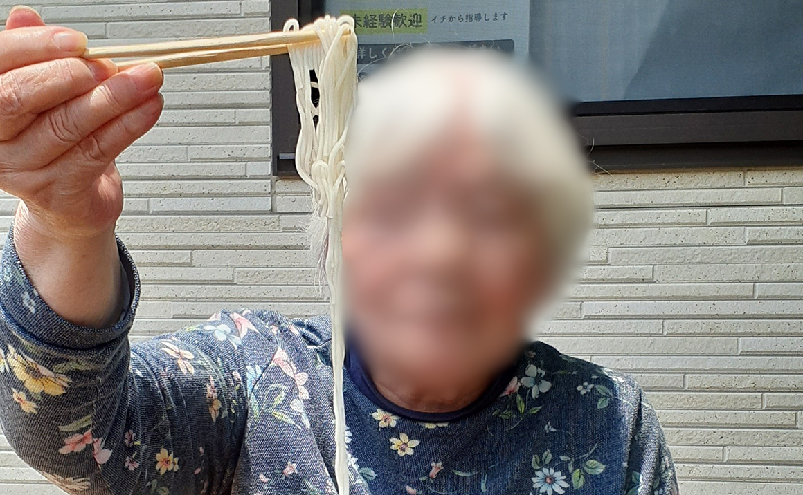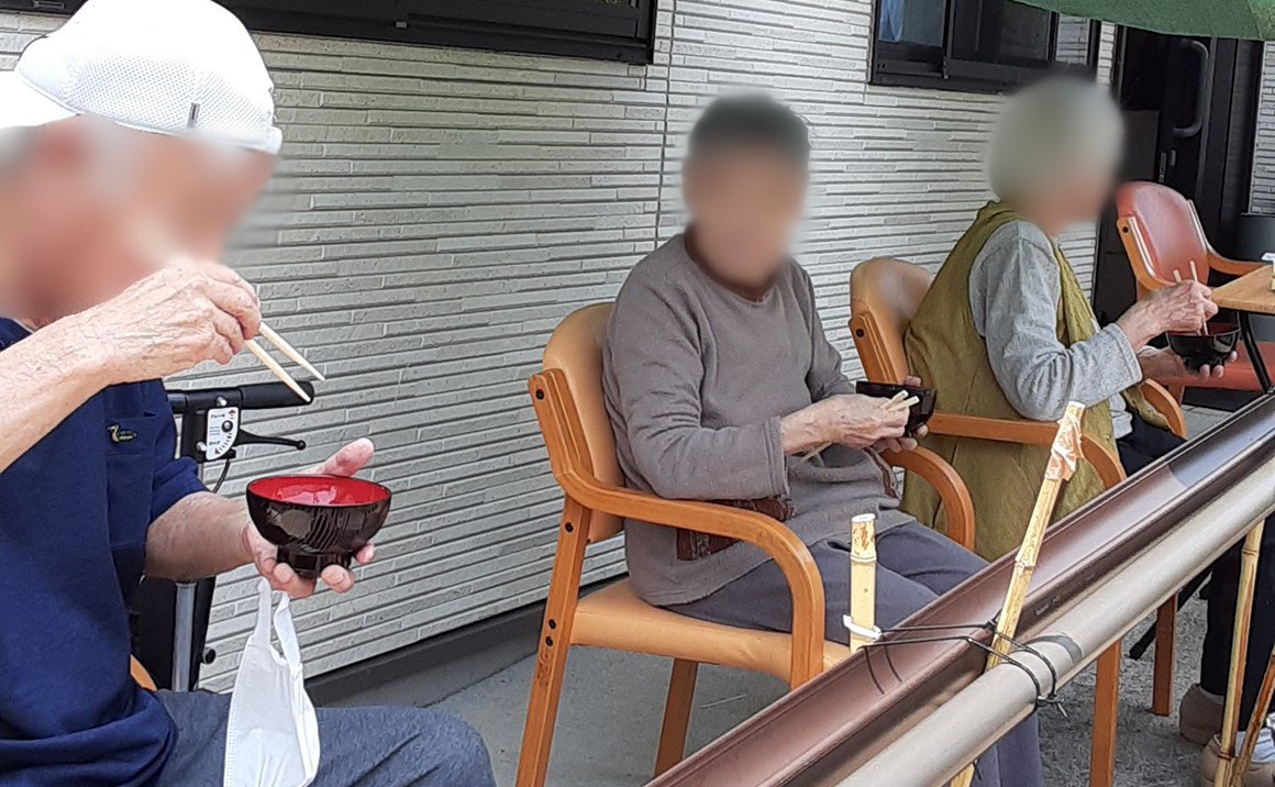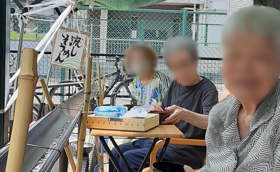 たのしい家栄生 今年も流しそうめん開催いたしました。 今年も6mのロングスライダー(雨樋)を流れるそうめんに利用者様皆さんが全集中でそうめんをすくい上げてワイワイ賑やかにいただきました。