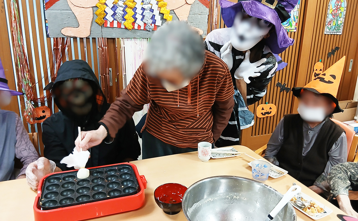 またこの時期がやって来てしまいました💦 たのしい家栄生のハロウィンタコパーティー💦 職員が毎回やりすぎ仮装でたこ焼きを焼いています。 利用者様もたまには刺激的なパーティーをノリノリで楽しんでいただけました🎃