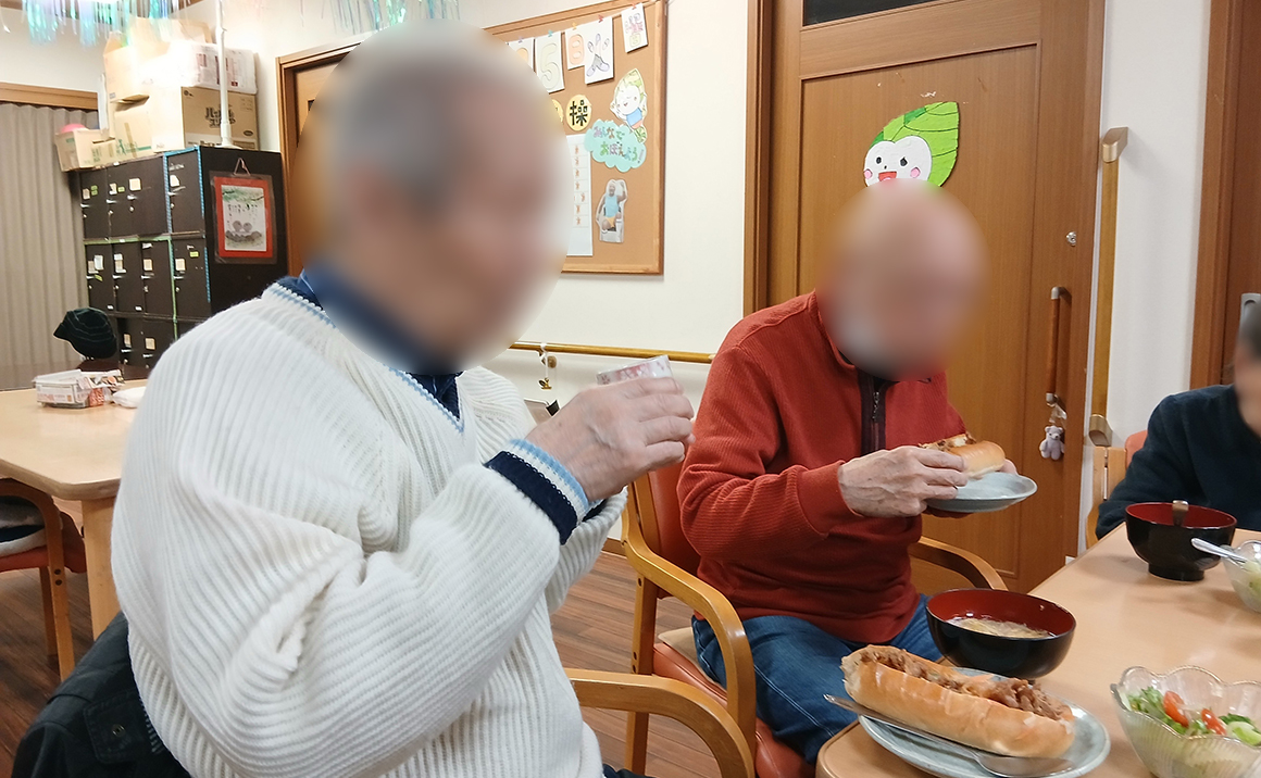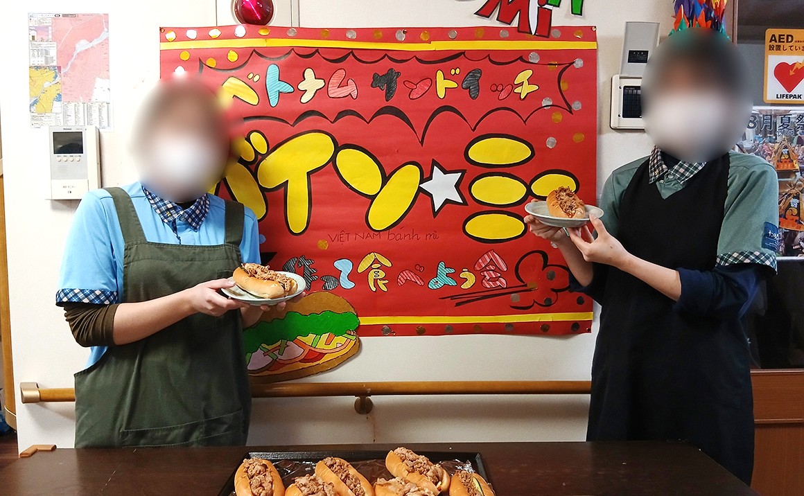 たのしい家栄生 ベトナム人実習生がベトナムのサンドウィッチ(バインミー)を利用者さんと一緒に作って頂きました。 本来はフランスパン?に肉や野菜を挟んでいくらしいのですが今回は食べやすいようにコッペパンを使って作っていただきました。