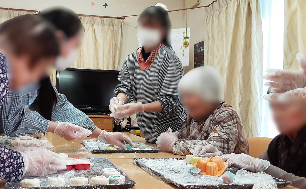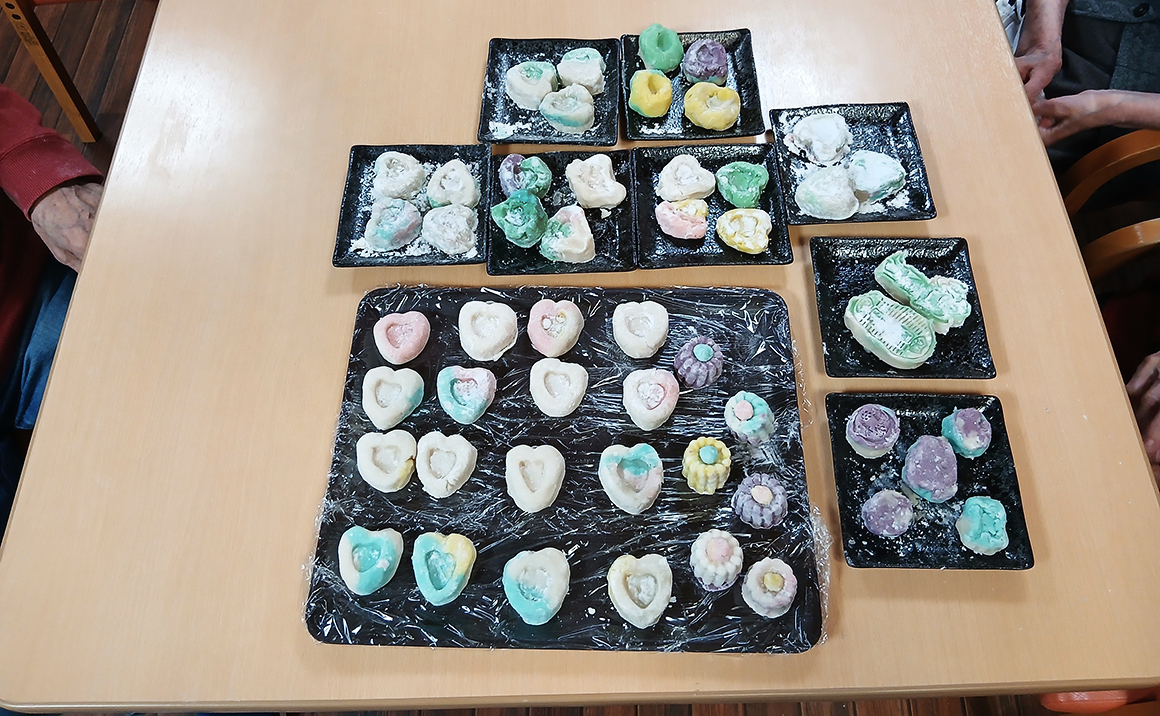 たのしい家栄生 今回は和菓子の『練り切り』作りをみなさんにやっていただきました。 練り切りは白あんに求肥、山芋を練りこんで作るみたいです。 見た目も味もこれまたお店クオリティーでした(@ ̄□ ̄@;)!!
