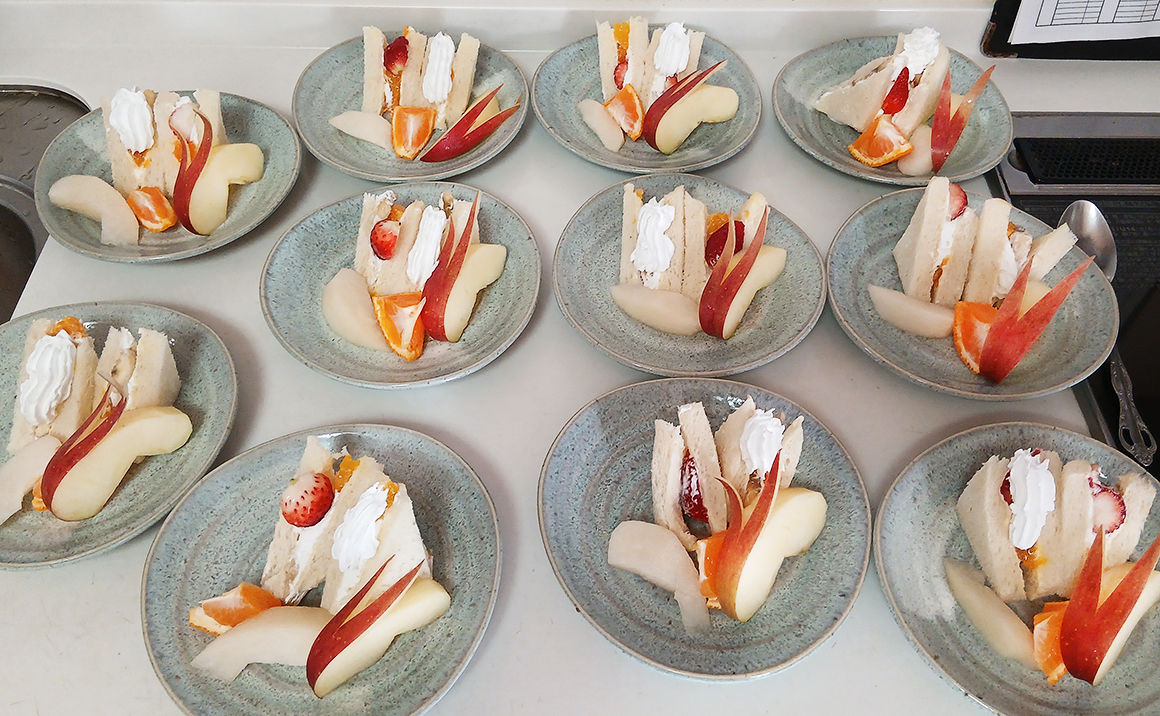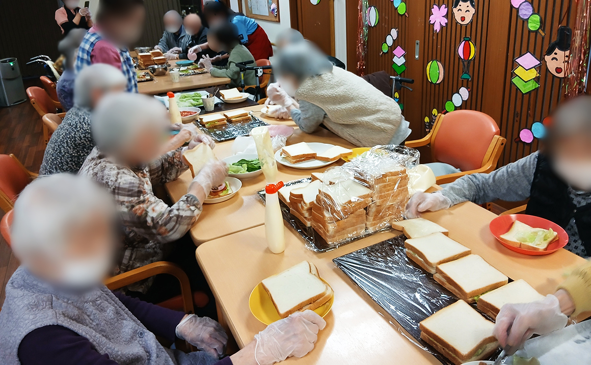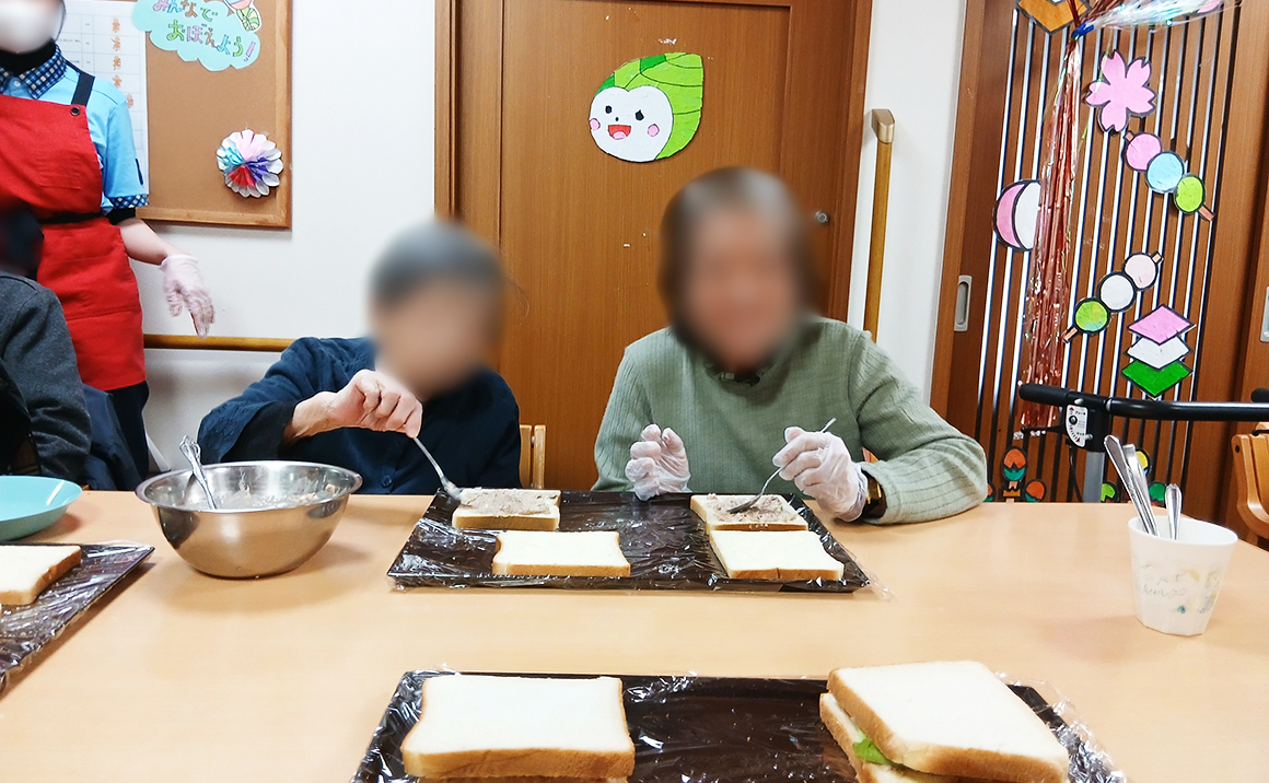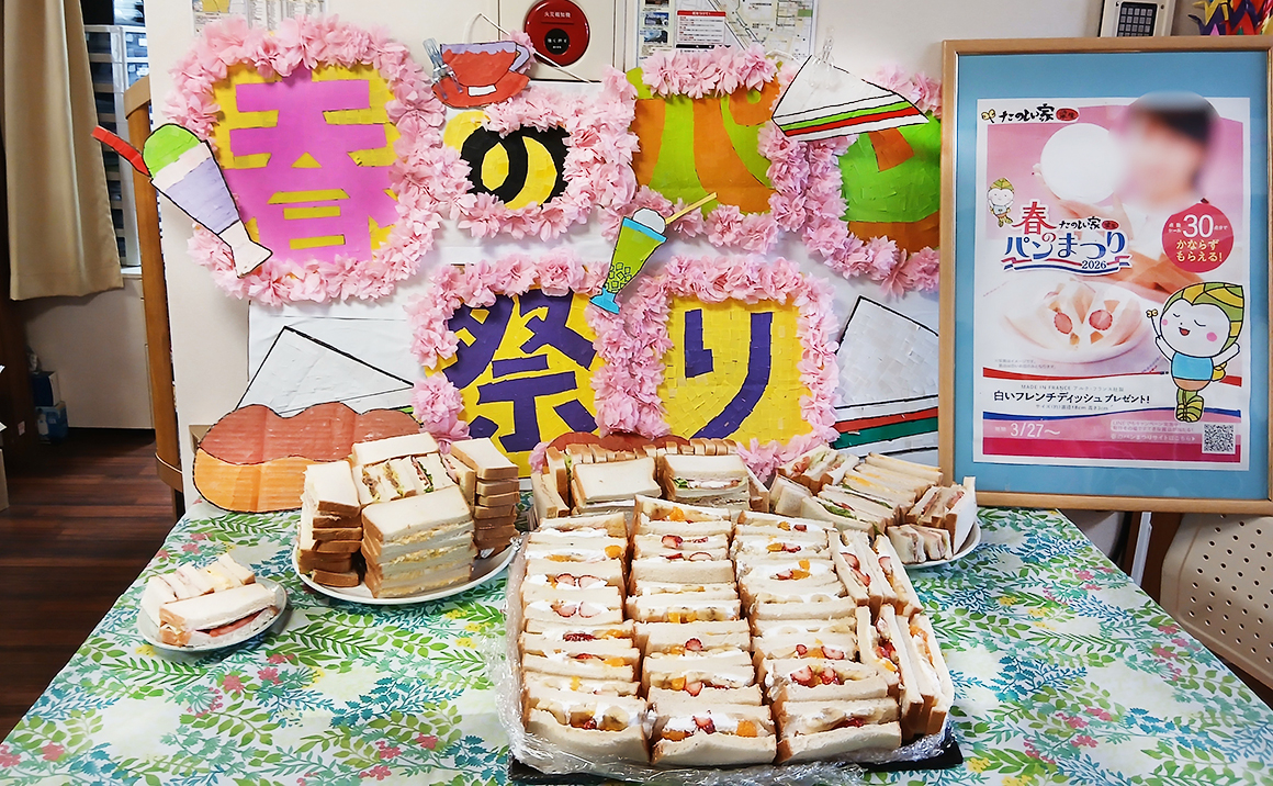 たのしい家栄生 今年も春のぱん祭り開催いたしました。色々なサンドイッチをみなさんでワイワイしながら作っていただきました。3時のおやつにもフルーツサンドを作っていただきました。