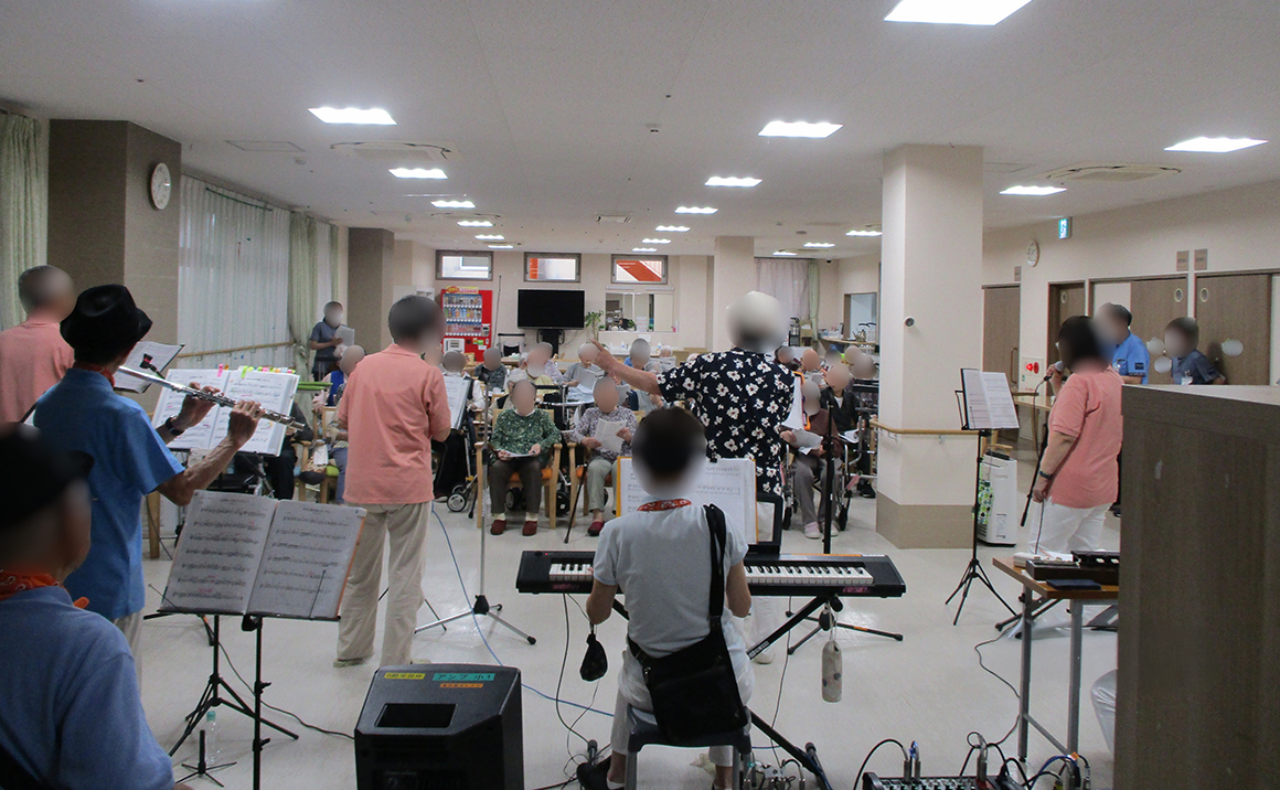 6月8日(日)にボランティアさんに来て頂きました。 今回は2チーム合同で合唱と生楽器での演奏を10曲して頂きました。 普段歌われない利用者様方もご一緒に懐かしい歌を口ずさまれ 楽しい時間を過ごされました。 ♪手のひらに太陽を ♪上を向いて歩こう ♪みかんの花咲く丘 ♪ふるさと ♪また君に恋してる ♪ああ人生に涙あり ♪旅人よ ♪銀座カンカン娘 ♪五番街のまりーへ ♪学生時代