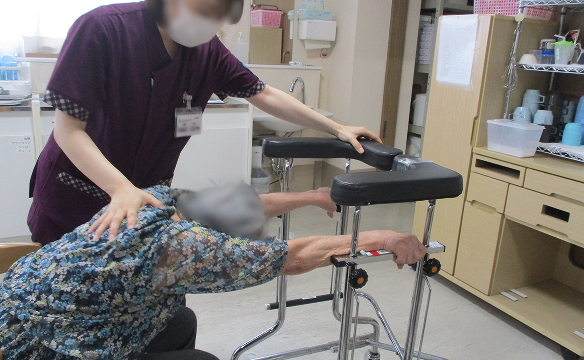 深く座った状態で真上に上がってもなかなか立ち上がれません。立ち上がりしやすくするために前にお辞儀をしながら立ち上がり訓練をして頂いています。
